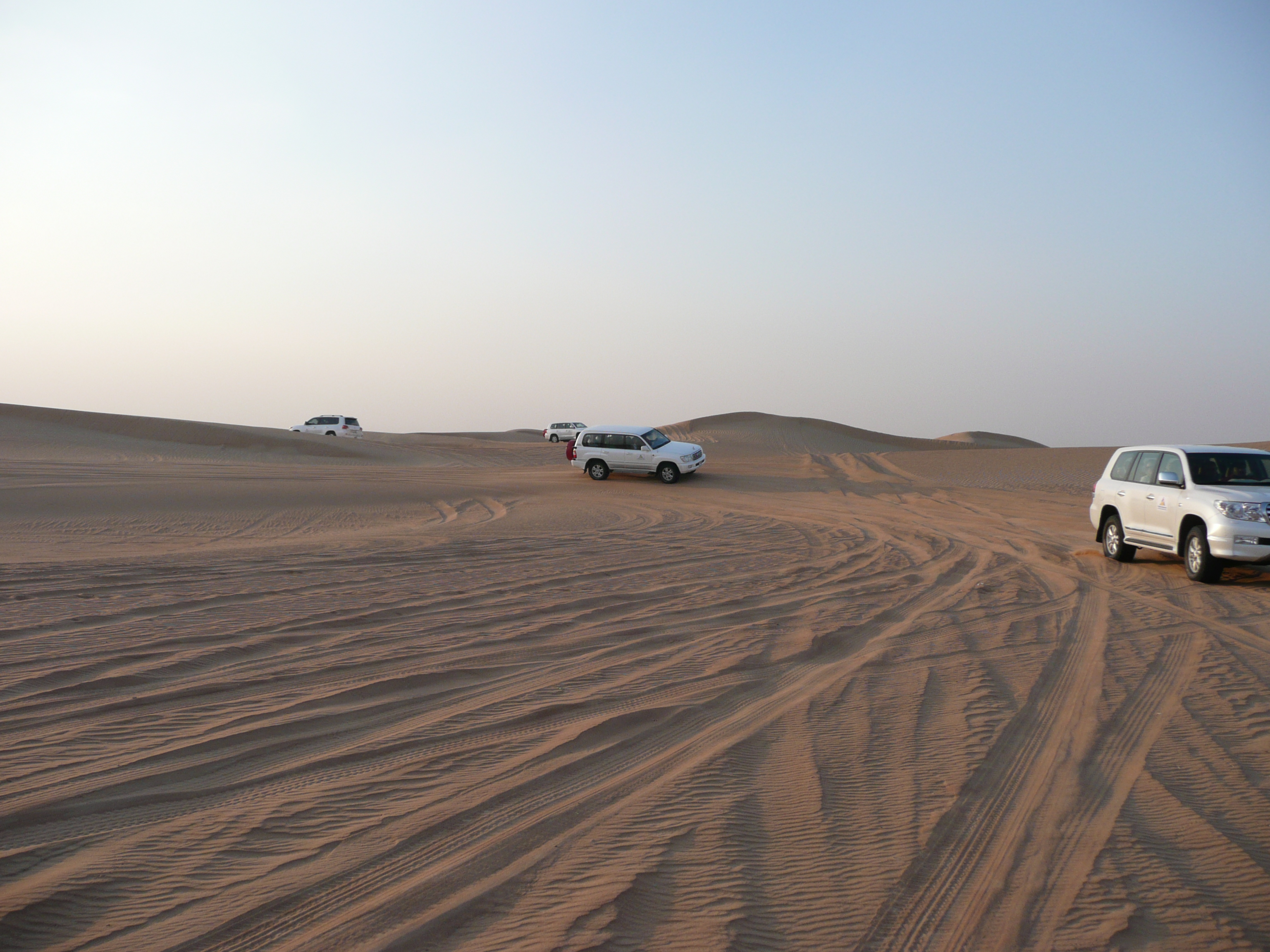 We were collected from the hotel by a silver 4×4. We then drove to two other hotels and collected other tourists, before driving off to the Dubai Conservation Desert. We then met up with several other Landrovers, all identical. They stopped and changed the tyre pressure, then we set off.