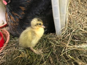 My broody hen has done rather well. Yesterday, when I went to let out the chickens, I could hear someone cheeping from the nest. I tried to see, but mother hen wasn’t moving, and I am wary of her beak. I checked several times during the day, but although there was often cheeping, there was no sign of any hatchlings. I wondered what it would be.