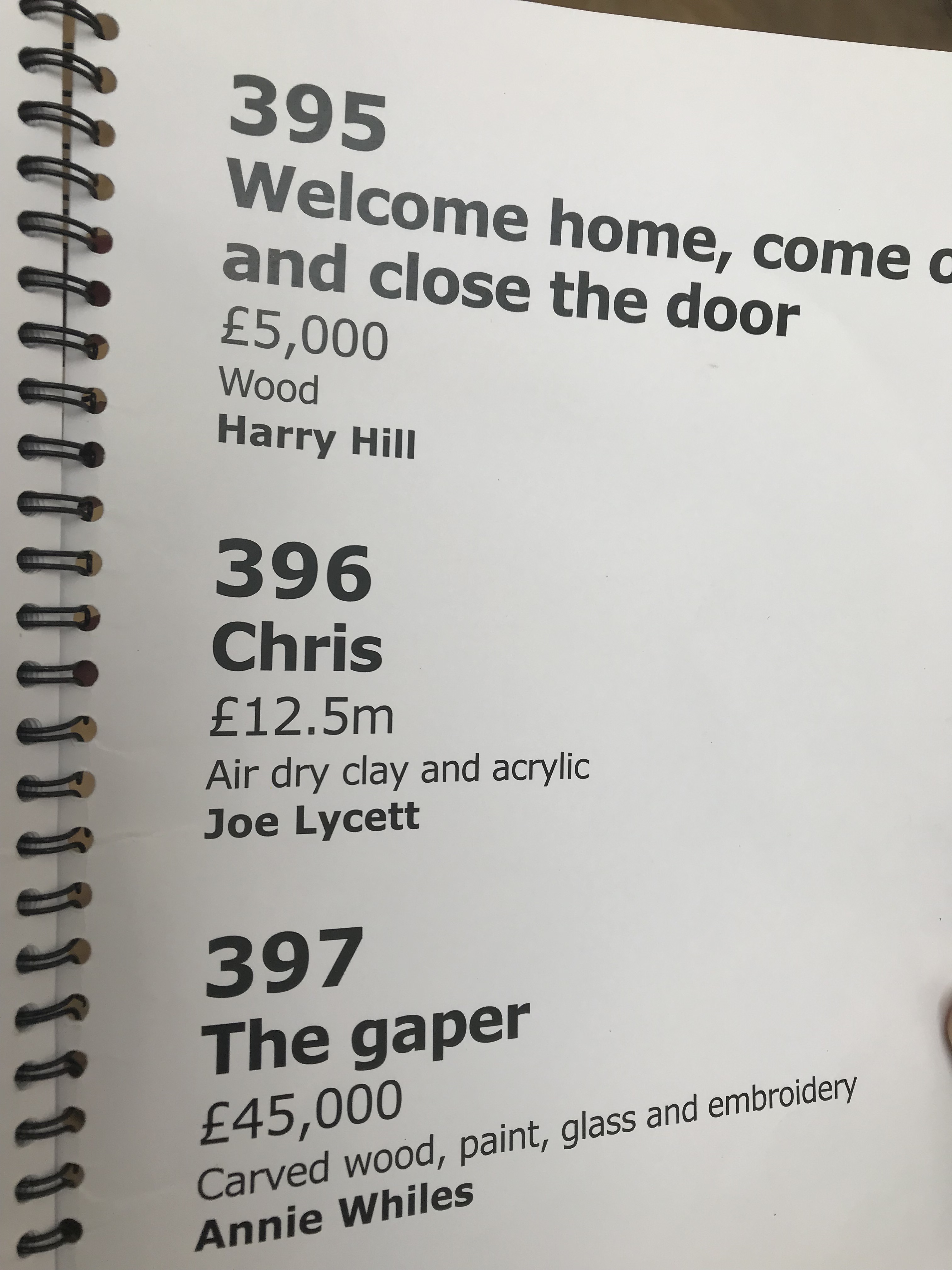 Much of the art, I really do not understand. When I got home, I tried to find online reviews of individual pieces, or at least explanations, but there weren’t any. Perhaps there are too many for the critics to cope with. I will therefore share with you my own highlights and lowlights of the exhibition. I am not an artist, so I expect I missed the point on some of them. However, as art is subjective, I will go ahead and give you my brutally honest review.