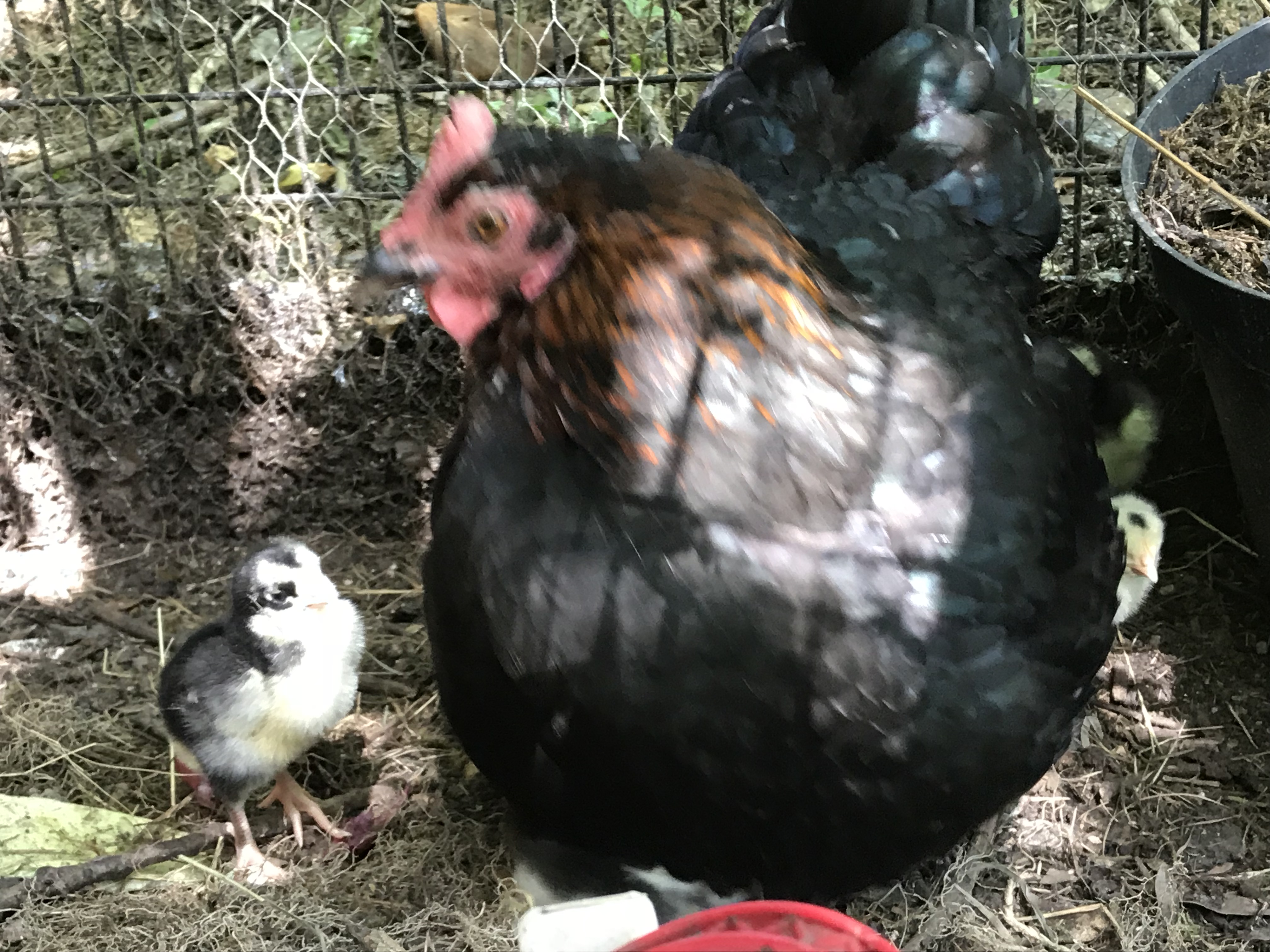 The six outside chicks are all doing well, and spend their days digging in the mud with mother hen, and snuggled underneath her in the nesting box at night. They regularly kick mud over their food and water, so it’s impossible to keep them clean. Whenever I go into the cage, the mother becomes very scary, and runs at me with her feathers all fluffed up, so cleaning out the water several times a day is less attractive than you might think. When I don’t back off, she gathers them all underneath her, and sits there, glaring at me. The chicks are unaffected, and like to come and see what I’m doing. I do hope they are not all cockerels.