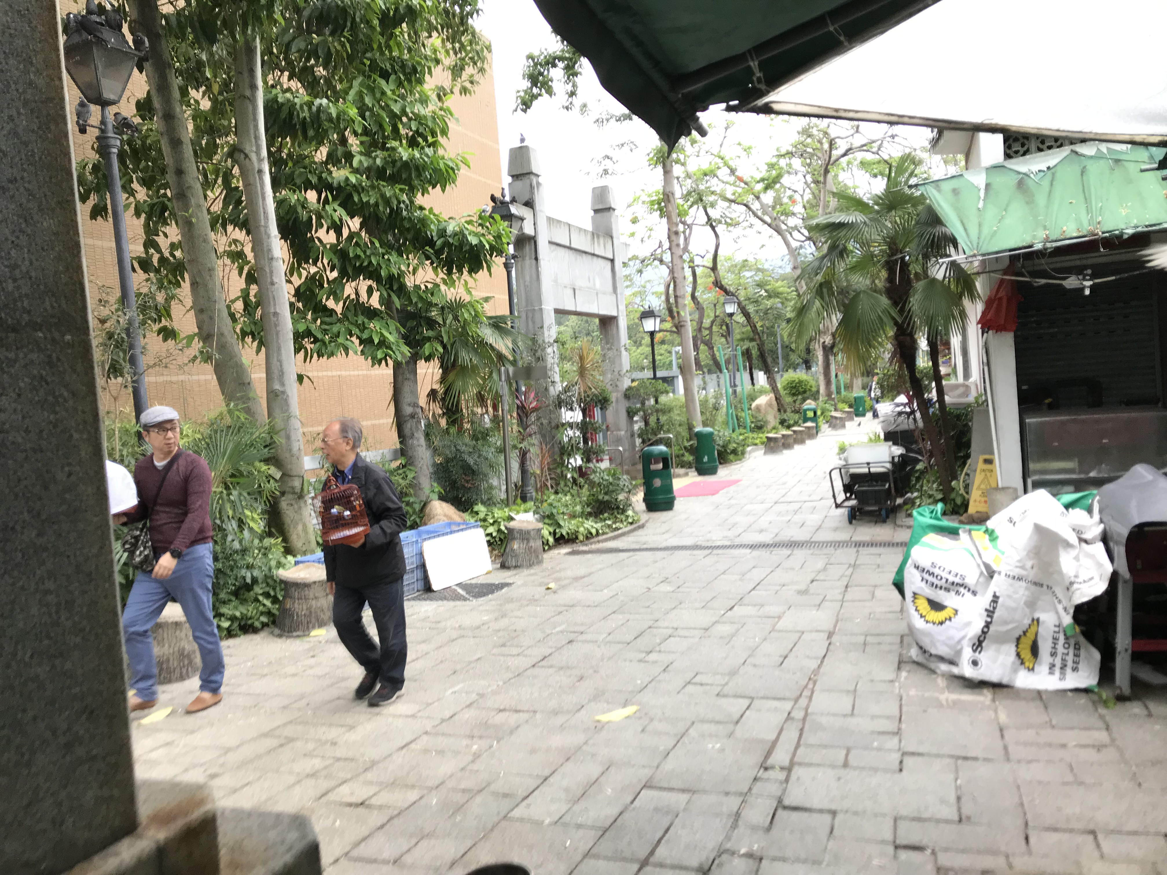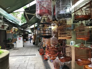 At the end of the road is the bird garden. It’s along an alleyway, and I wasn’t sure, at first, whether it was sensible to walk there on my own. But then I saw an old man, carrying a birdcage, so I decided it was worth the risk. The alleyway soon opens out into a little Chinese market. Here, you can buy anything you need for your pet bird. There were sacks of grains, and bags of live insects, and different kinds of cages. People bring their birds here, and hang them up, then sit and chat to each other—a bit like taking your dog for a walk. I did see several elderly men walking around, carrying their birdcages, but I felt I should only take surreptitious photos, so you’ll have to imagine.
