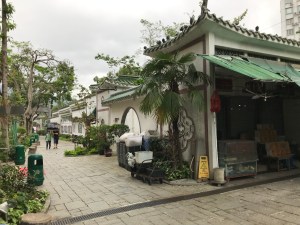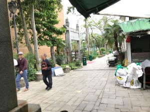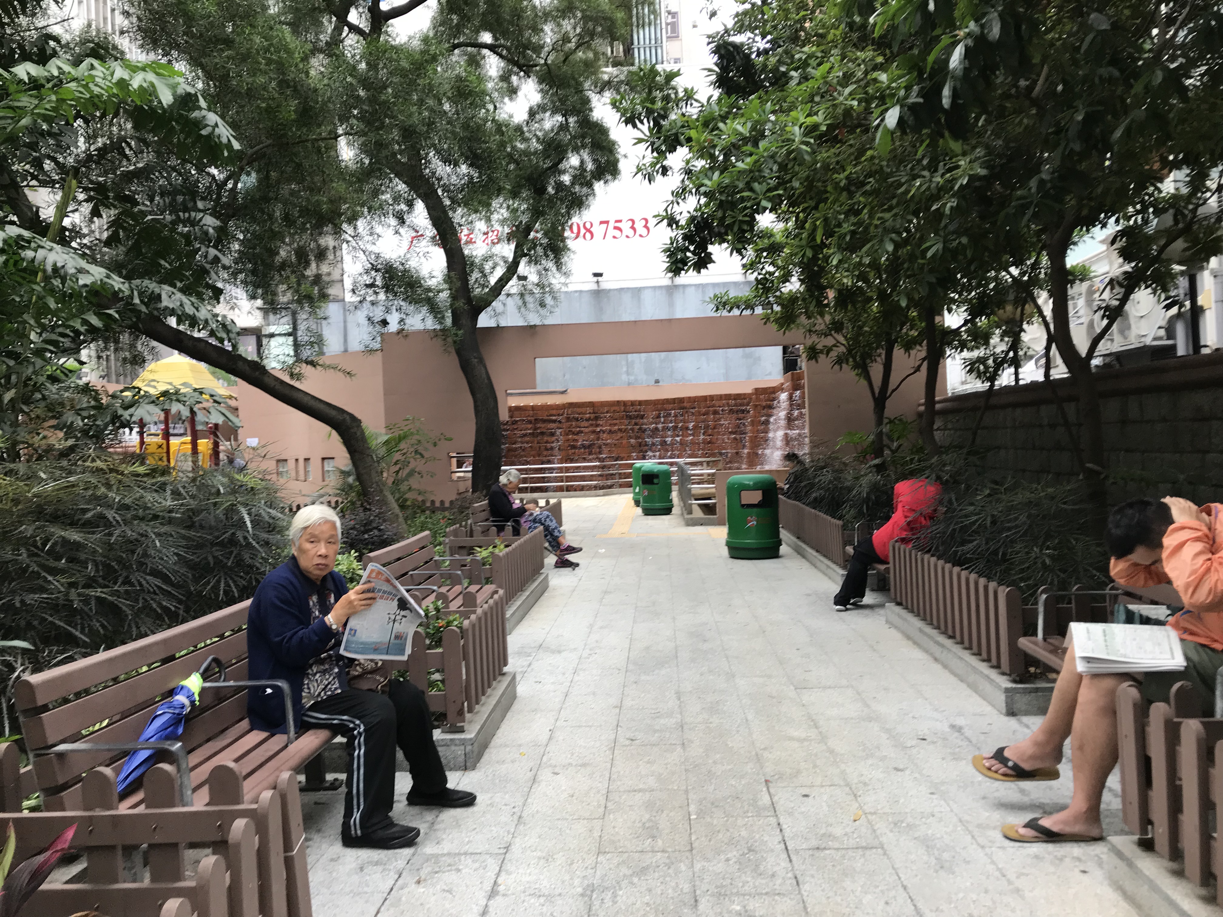 I reached Boundary Street. This is very straight, and marks the line that was drawn when the British said they needed more land because Hong Kong Island was overcrowded. They were given this part of Kowloon (apparently in perpetuity, but that seems to have been forgotten now). There is another tiny park on the corner of Nathan Street and Boundary Street—with a water feature, and plants and seats—rather overshadowed by the huge fly-over which looms above, so you aren’t tempted to stay for long (unless you are deaf—being deaf might be quite nice in Hong Kong, which is one of the noisiest cities I have visited).