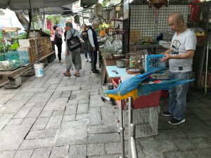 Behind the stalls, people were chatting, eating their lunch, making birdcages, and feeding the birds. I don’t like birds in cages, but if you suspend moral judgement – which I think you ought to when visiting a culture you don’t understand fully – then it is terribly interesting. The best thing, I thought, were all the wild birds who came for a free meal. All the sacks of grain had sparrows and pigeons having a feast, almost as if in defiance in front of all the caged birds.