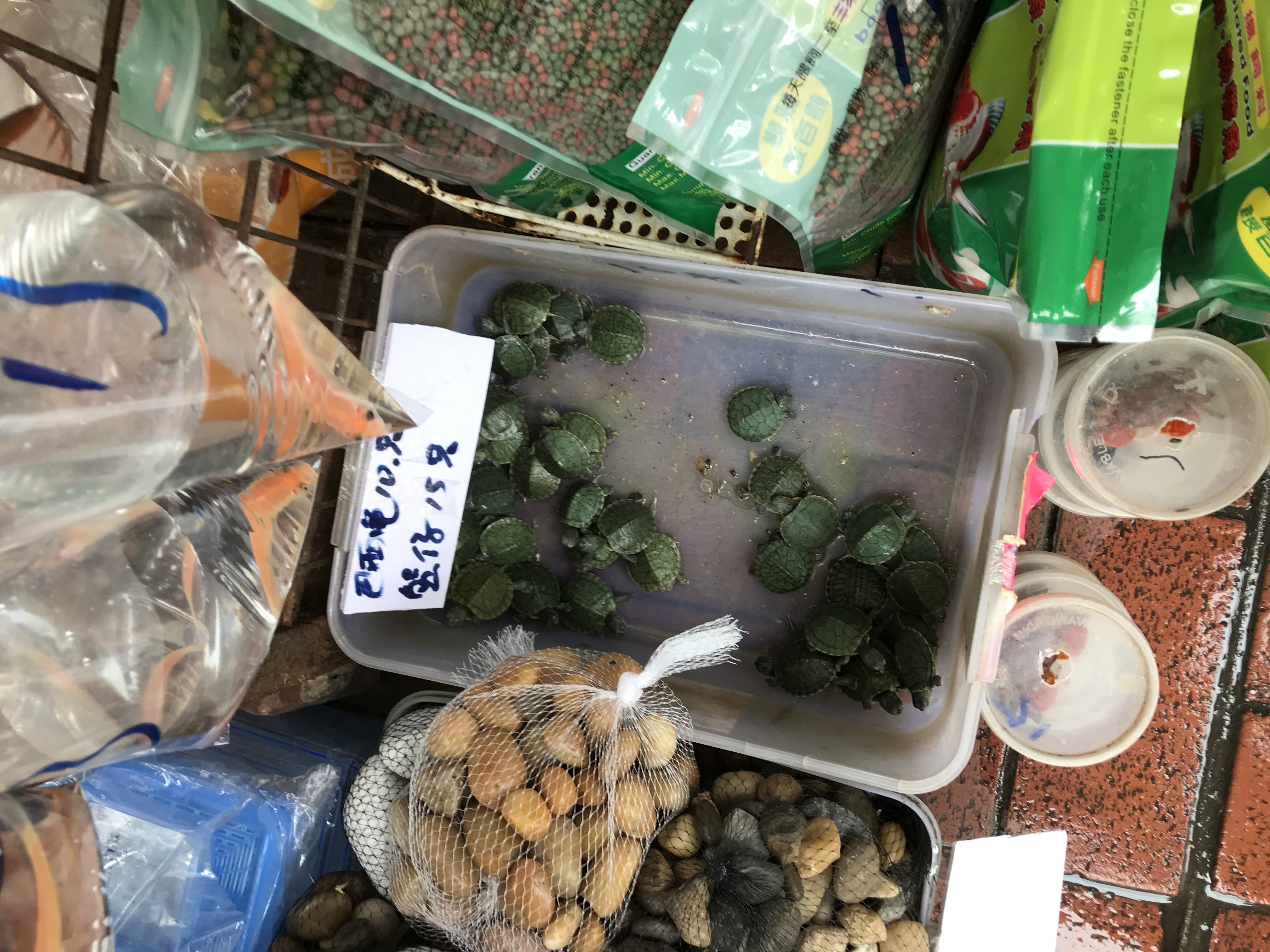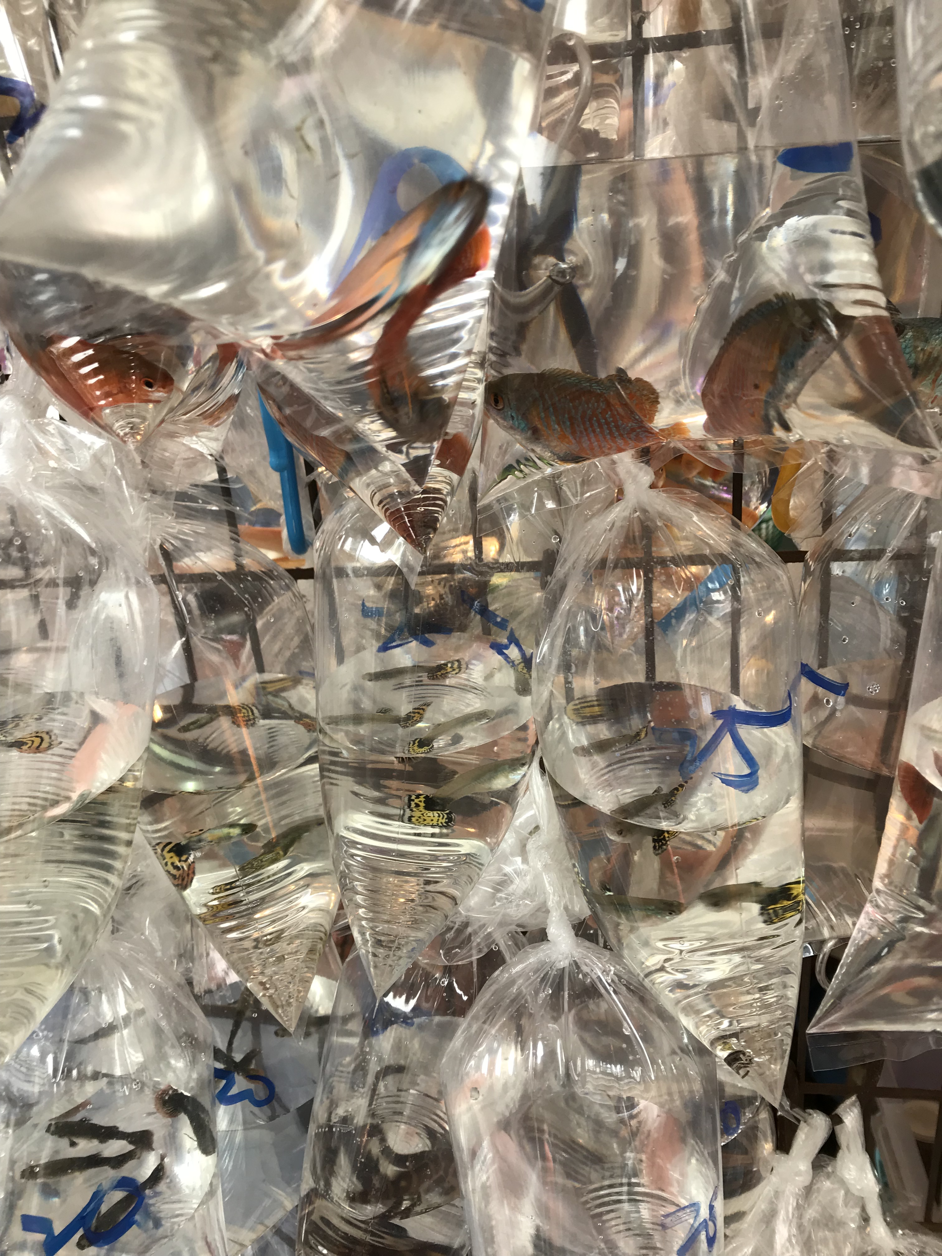 I walked back along a street full of fish—goldfish of all sizes, in bags of water, strung up on stands in doorways. Presumably they all survive, as there was shop after shop of them but they reminded me of the fish we used to win at fairgrounds, and they always died.