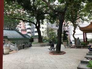 I reached Nathan road, which is wide and busy, with bigger shops and people look richer, like office workers or tourists. There is a rest area – a small park with granite seats, and trees next to Chinese-style bridges and roofs, sparrows hopping on the ground. I sat for a moment and drank some water, but all the time there is the loud drone of traffic edging along the road—buses and lorries and taxis—it isn’t peaceful unless you’re deaf.