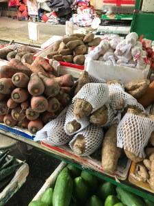 I found Saigon Street, and the markets, and wandered around. There were meat stalls, with chicken’s feet in heaps, and dried meats hanging on strings, and great fish-heads staring blankly, while shellfish slithered in overcrowded tubs of water. Many of the stalls sold fruits and vegetables, shining in the rain, pools of colour and textures, some smooth and shiny, others lumpy or with spikes. Many of the fruits were new to me. Some of the stalls had music playing, the stallholders whining along in unison. There was a flower stall, with tubs of lilies and roses—but it didn’t compare to the shops in flower market street yesterday. Mostly, the markets were wet, drops of rain falling from the awnings, people avoiding umbrellas, the ground slippery. Rusty carts and damp boxes had been discarded at one side, along with heaps of rubbish and slurry.