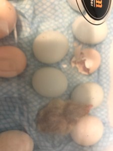 I had pretty much decided that all the eggs had died, when I noticed two were trembling. When I listened, I could hear them, cheeping away inside the eggs. This is always so exciting, knowing that there is a chick inside an egg, and having to wait until it hatches before you can see it—a wrapped gift, hidden from sight. Forced myself to not open incubator again, and to just wait.