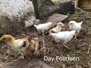 The remaining 8 chicks are all vibrant and growing well. They run madly around the cage, eat and drink independently, and then suddenly, with no warning, will close their eyes and be asleep. They are still clustering under the lamp to sleep, so it’s not time to raise it yet (as they develop feathers, I will move the lamp further and further away, until they no longer need it.