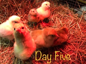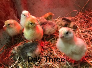 The second chick was accepted, so I began to add another chick every half hour. Each time, the chick cheeped, the hen made her low growling noise, the chick gradually drew nearer (I’m guessing because she was warm) until the chick was actually leaning against her, crawling under her, climbing on her. All seemed to be going well, and I was feeling extremely relieved.