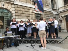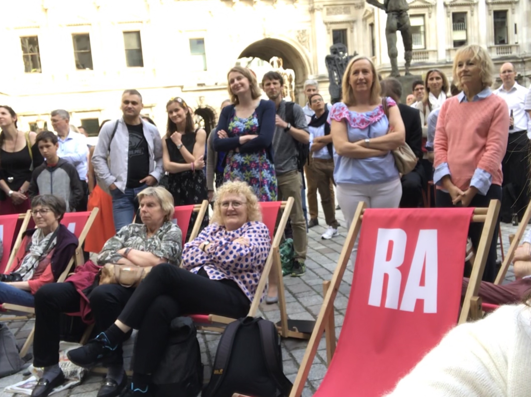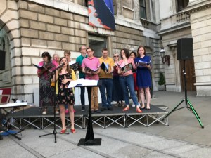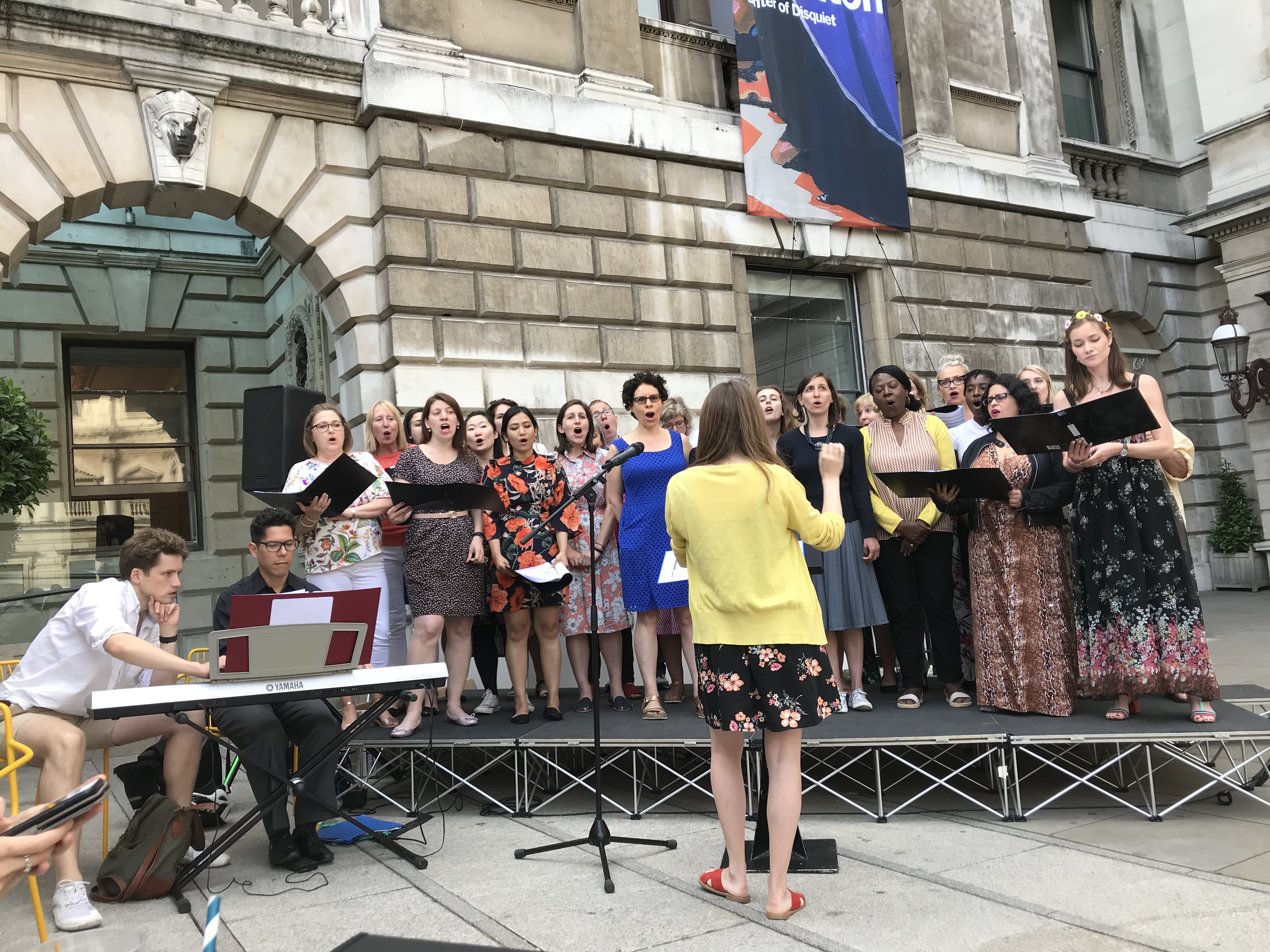 It was a lovely sunny evening, and Bea managed to find me a seat right at the front, and someone kindly bought me a glass of white wine, so things were pretty perfect from the start. We sat in the courtyard of the Royal Academy (beneath what look like giant zombies, but we’ll brush over that weirdness). The evening was a variety of choirs, from a variety of workplaces, who took it in turns to sing 3 songs each. There were choirs from UBS, and Channel 4, and The Telegraph, and a London council, amongst others. Apparently, there are musical people, who go around, and teach choirs at all these businesses. Now that must be a fun job!