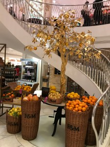 The basement is full of food, and I had a voucher. There was a golden tree, surrounded by citrus fruits. I love pomelo (which look like giant grapefruit) but I first discovered them in Morrisons, and these were triple the price and not ripe. A chocolate orange was also tempting—brown-skinned and grown in Valencia, the sign said it was very sweet.