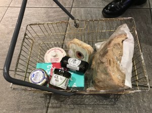 I also bought some sour dough bread (I found some that was wrapped, and safe from stranger-sneezes!) and a china pot of Welsh rarebit, four miniature puddings, a pat of black garlic butter, a packet of blinis, and a tiny pot of pesto.