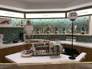 In the end, I chose a tiny jar of fish eggs (sort of pretend caviar, but rather cheaper than the £400 price tag I saw for the real thing!) A man was cutting thin slices of salmon, and he chatted to us for a while, and offered us a blini—a tiny pancake topped with salmon and cream cheese. Behind him, there was a blini-making machine, and we watched it while we chatted. Really, the staff were very friendly.