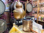 The Greensands Ridge Distillery is a small industry, set up in an old stables and coach house. We were welcomed into a large room surrounded by barrels and fancy-looking copper equipment, and offered tea and coffee. It was very good coffee, though it felt wrong to be drinking coffee when surrounded by stills and urns and delicious smells. The owner, Will, then gave us a short talk about gin, and gave us a small plastic thimble of Raspberry Ghost, which tasted like a fruity brandy (which I didn’t much like). We learned that distilling produces a clear liquid, leaving all the sugar and colour and proteins behind. I remember this from chemistry lessons at school.