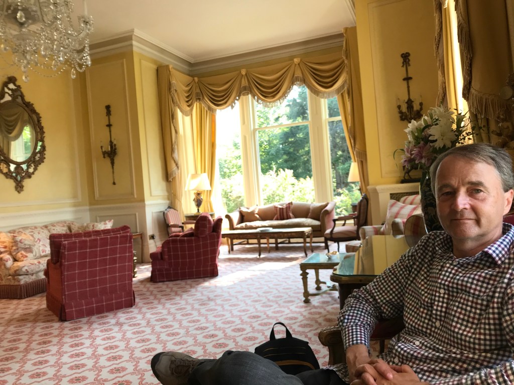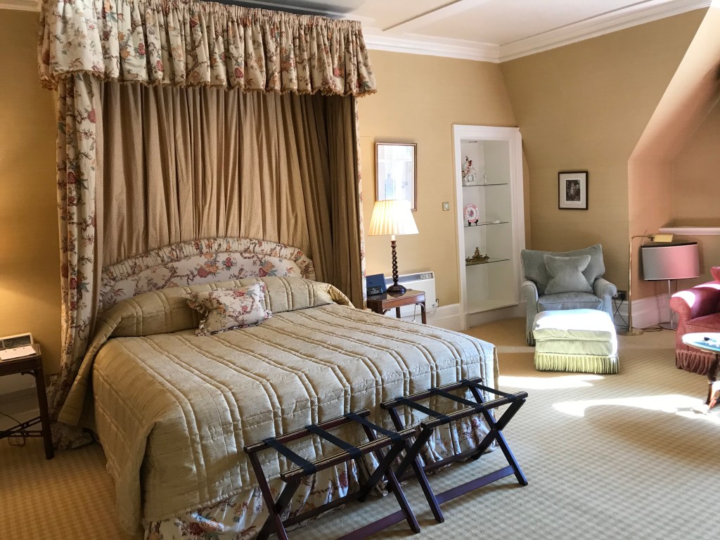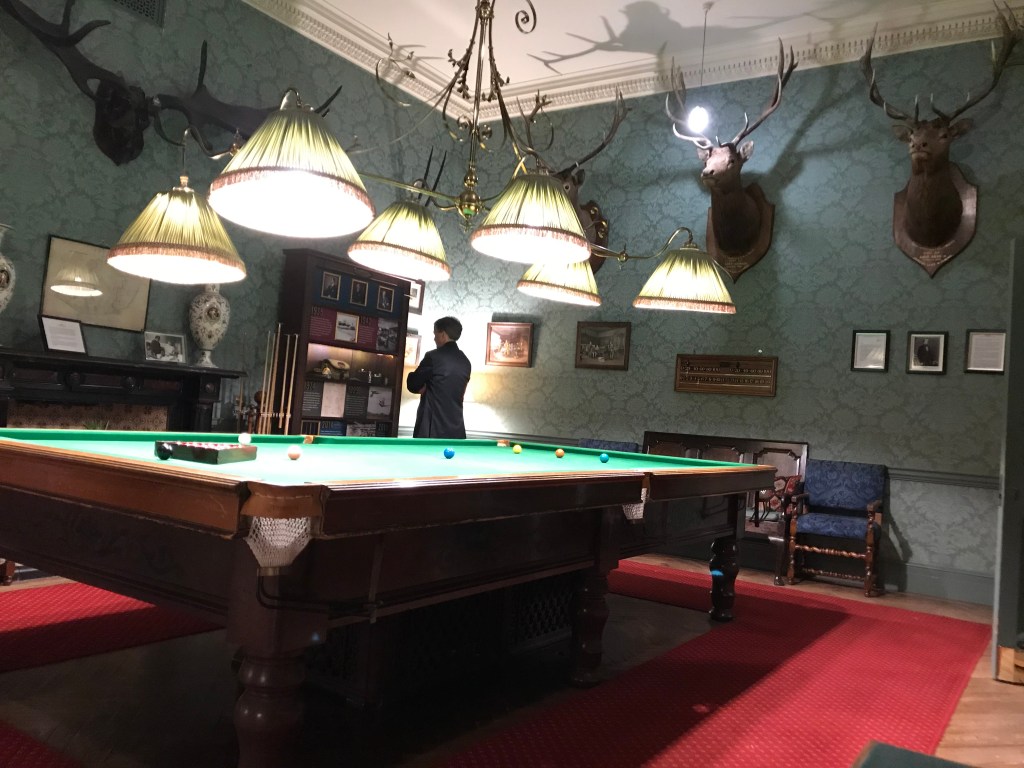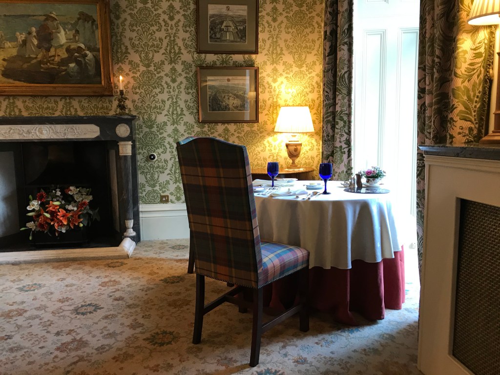 Dinner (6 courses) was in a pretty dining room, and there were drinks first in the sitting room, where there was a fire in the hearth and views across the lawn to the mountains. I don’t usually drink much, and half a bottle of red wine after a G&T was quite a shock to the system! We went back to our room via the rather fine billiards room, but I sat in a big leather chair and wondered if I would make it up the rest of the stairs, so a game of billiards was never going to happen!
