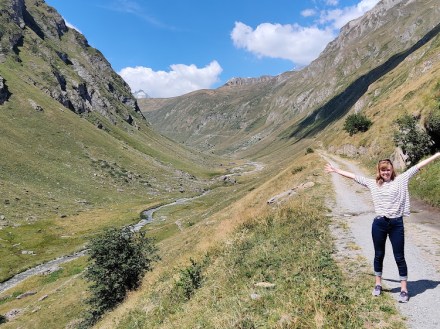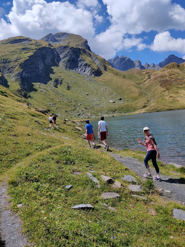 We walked. The track rose gradually, gently taking us further from the valley floor. We could see a river, and guessed the speed of it. There were trees below, dwarfed by the distance between us, dark green pines clinging to the side of the mountain. Patches of grass were dotted with brown mud, dug out by marmots which scampered away when they heard our voices echoing round the valley. (I must say, I will never ever manage to see much wildlife, because my family is so noisy!) Streams trickled from the rock next to us, forming puddles before trickling down to join the river. As we stepped over the puddles, clouds of blue butterflies rose, dancing around us like a host of fairies with blue and gold wings. We could see cows with their clonking bells in the distance, and beyond them, beyond everything, there were the mountains, watching. It was truly beautiful.