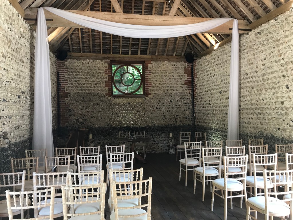 Today, the possible venues are varied. My niece’s wedding was in a barn, and the layout was almost exactly the same as any small chapel, with an aisle and flowers and rows of seats facing the front. There was even a wooden lectern to rest a book on. In England a non-church wedding can’t include hymns or prayers or Bible readings, but there was music.