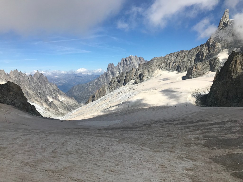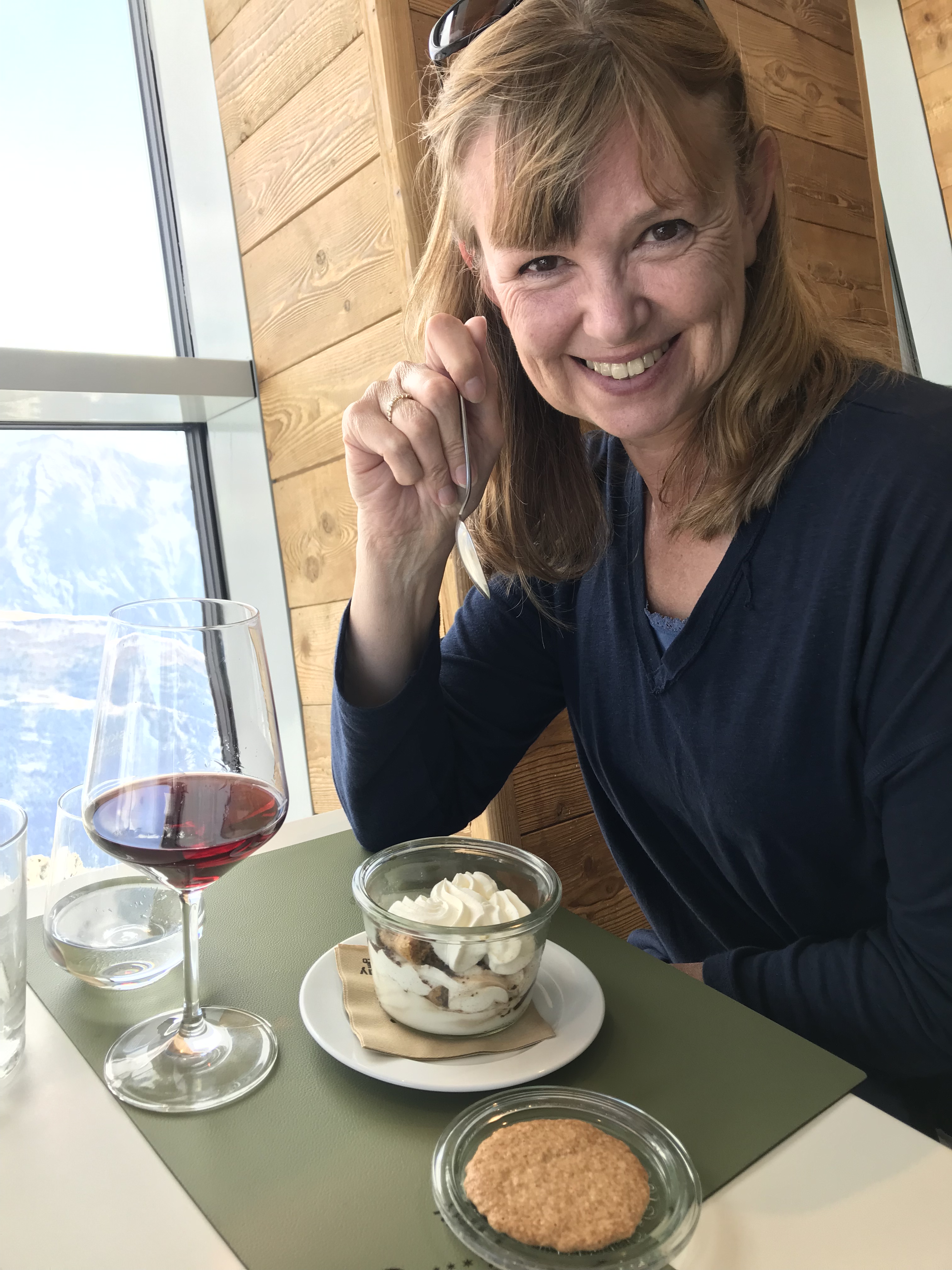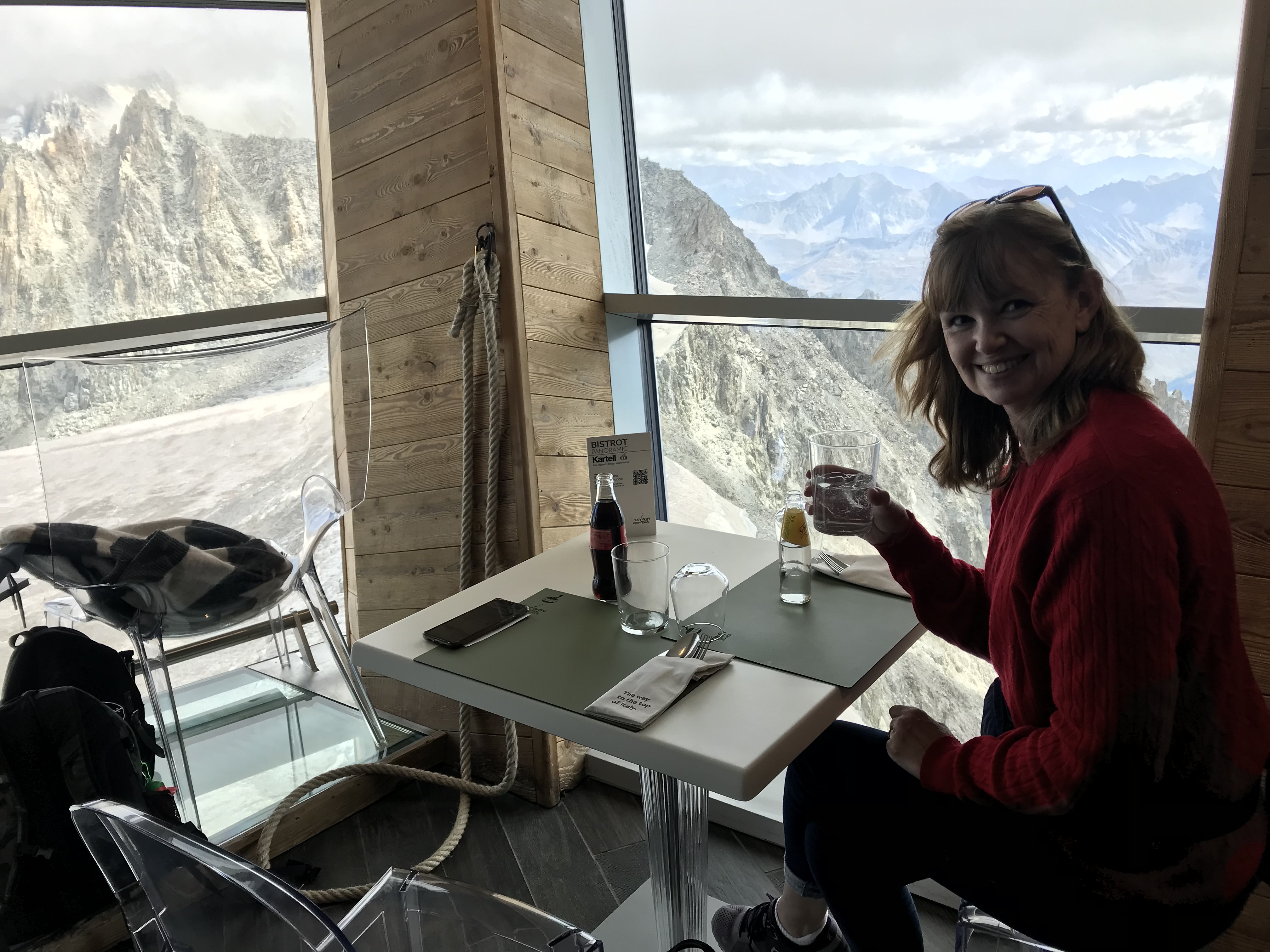 The top of the mountain had various viewing platforms, but we went straight to Bistrot Panoramic. It sits on top of Pointe Helbronner (which I understand is one of the peaks of Mont Blanc). The views were amazing. The restaurant walls were glass, and the seats were transparent, so wherever you sat there would be views. We were slightly early, and managed to have a corner table. After a quick gin and tonic, this was fine, and I rather enjoyed it. I had some red wine too to prepare for the descent (hence the slight headache now).
