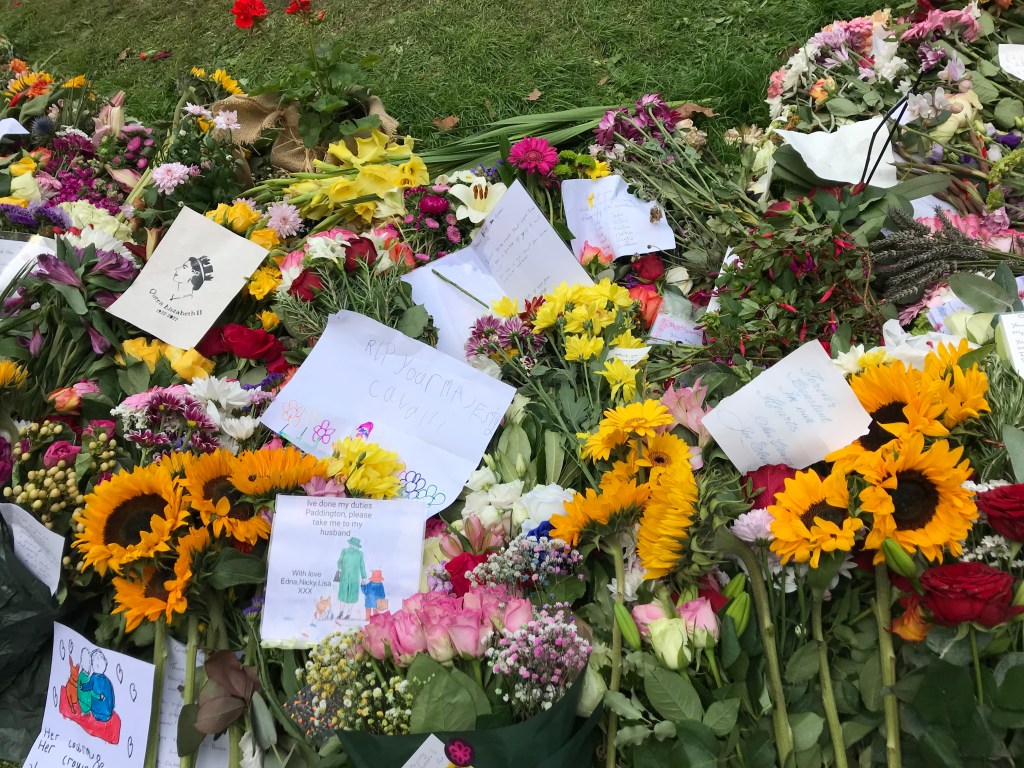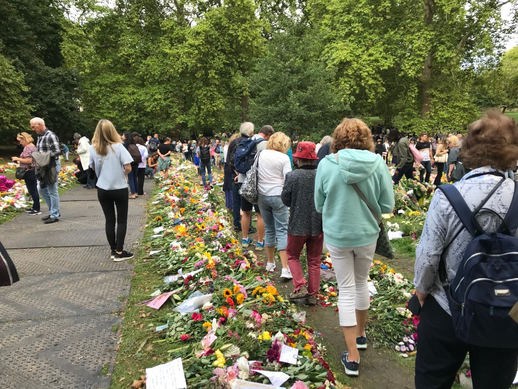 There were a lot of flowers. There were flowering orchids in pots, and arrangements, and bouquets that had been unwrapped and were lying in lines. Cards and letters were secured on top, damp and smudged, carrying messages from school children and people who had met the Queen and people who had watched her from afar. People were respectful, there was no shouting or laughter, but neither did I see any tears. The atmosphere was peaceful, grandparents showing the flowers to children, young people placing bouquets along the line.