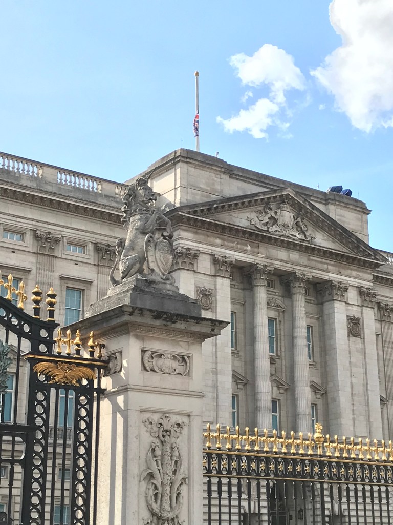 I followed the crowds towards the palace, and we were soon directed between barriers, filtering towards Green Park. We passed Buckingham Palace, the flag flying at half-mast, the guards on duty, extra police standing at street corners. There were signs, and toilets, and marshals wearing purple vests who were directing people and answering questions. We walked along the edge of the park, to Wellington Arch (so we had walked two sides of a triangle!) then back into Green Park, to an area cordoned off for flowers.