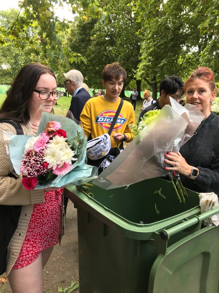 On Thursday I went to London. I wanted to see the flowers, to be part of history while it unfolded, part of the community. When the train reached Croydon, I began to notice people carrying flowers, the station was full, there was a sense of people who had a purpose. There were more flowers at Victoria Station—a pop-up shop selling bouquets at inflated prices.