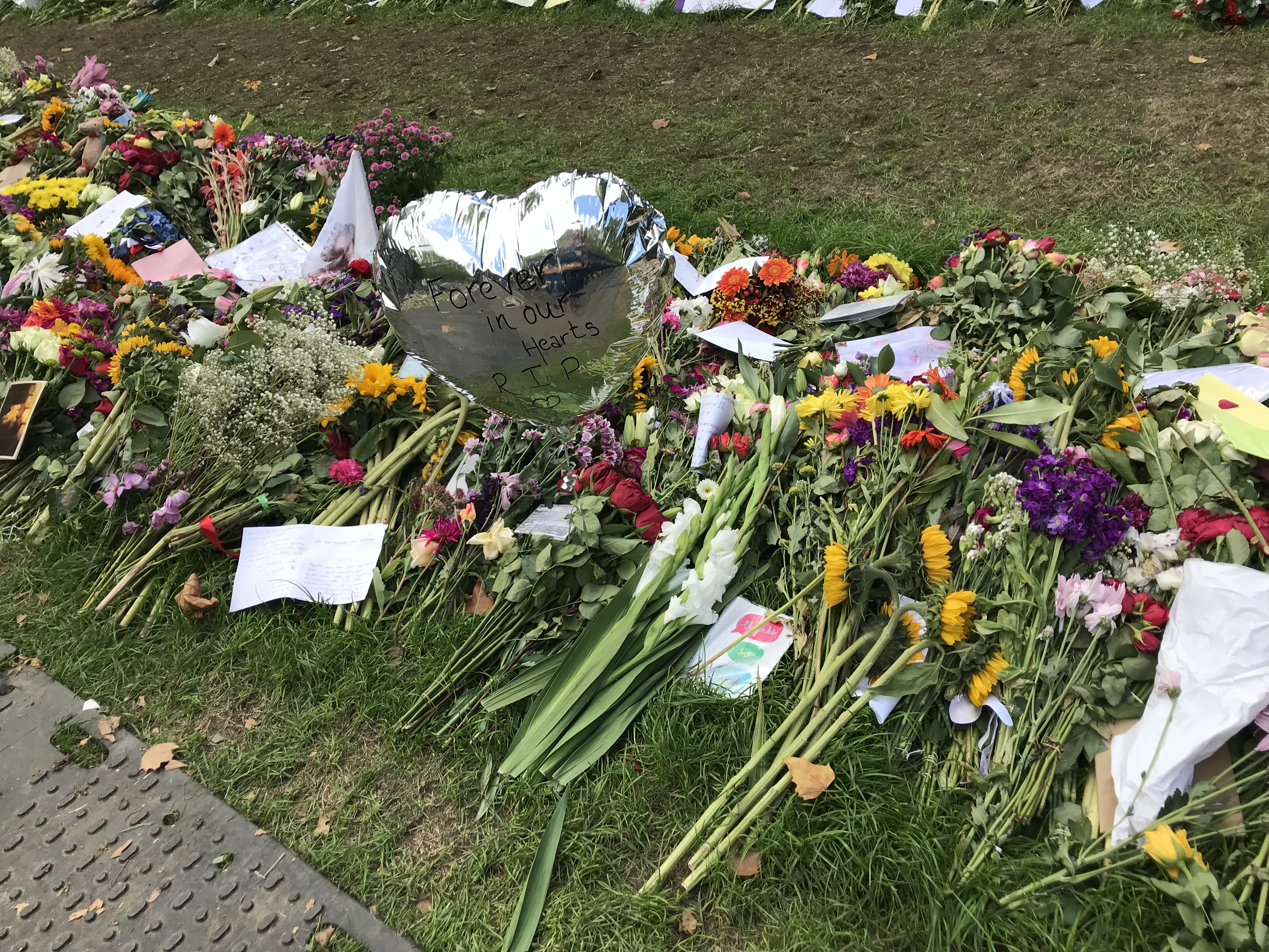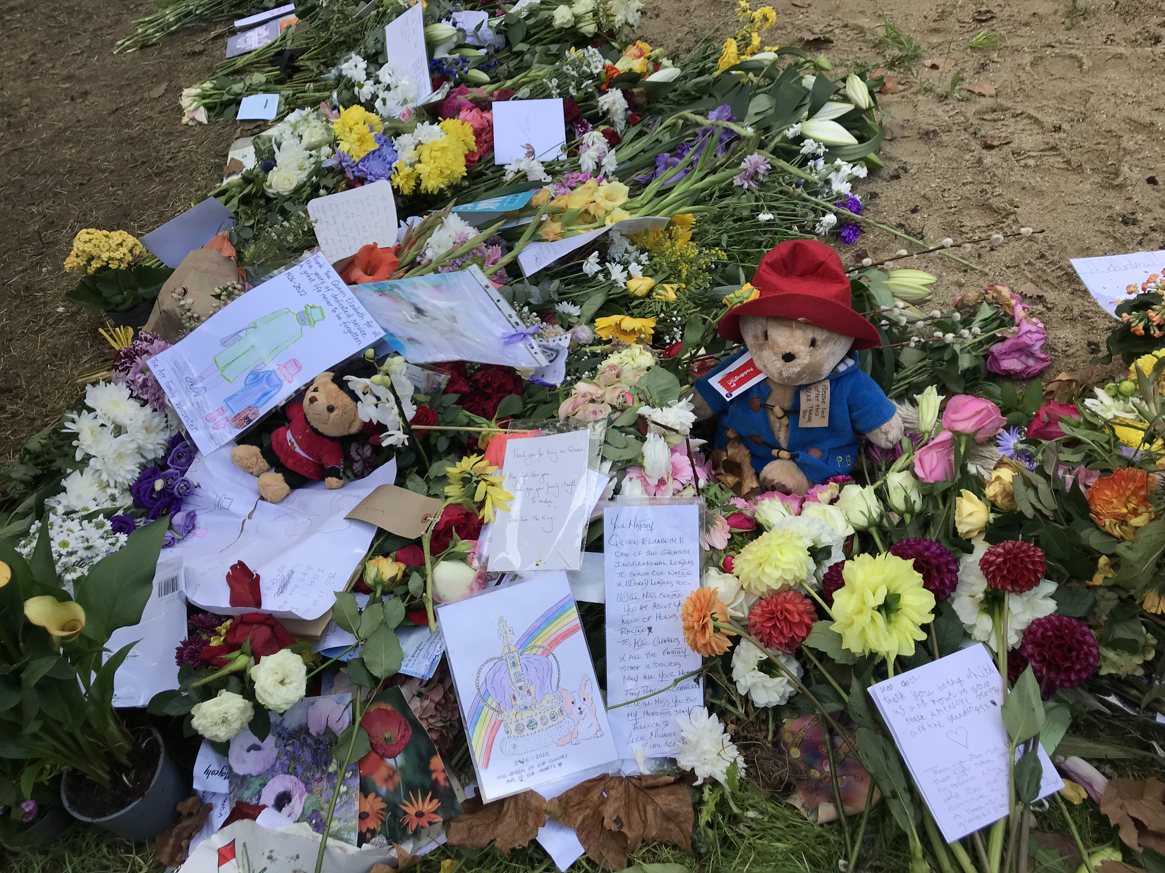 There were a lot of flowers. There were flowering orchids in pots, and arrangements, and bouquets that had been unwrapped and were lying in lines. Cards and letters were secured on top, damp and smudged, carrying messages from school children and people who had met the Queen and people who had watched her from afar. People were respectful, there was no shouting or laughter, but neither did I see any tears. The atmosphere was peaceful, grandparents showing the flowers to children, young people placing bouquets along the line.