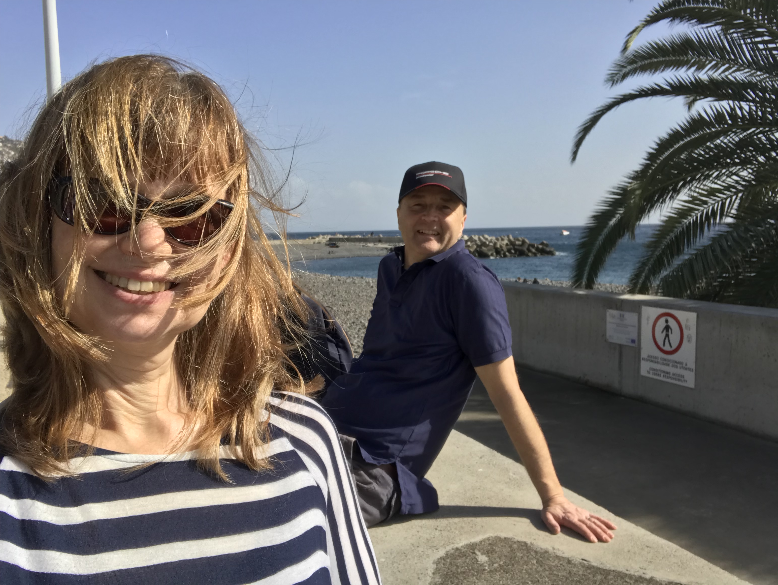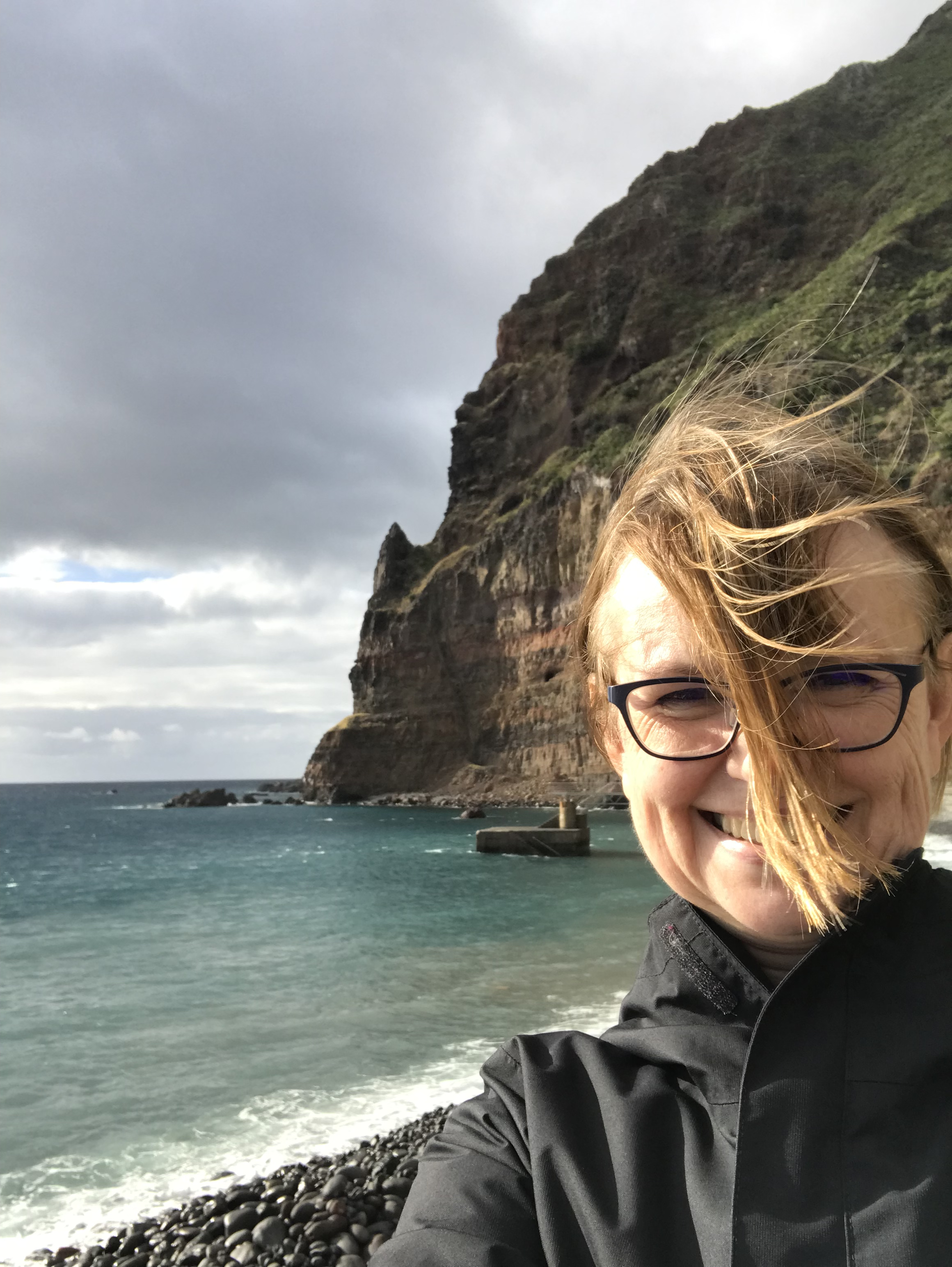 Our last stop was Praia da Calheta. This was a busy town, full of people, cars trying to park, cafes and supermarkets. There was a small marina, with little boats bobbing in rows, and a long promenade with palm trees and cafes. There were also beaches, with yellow sand hauled from Africa. Despite the cold, several teenagers were swimming, their squeals piercing the air. Steep cliffs bordered the coastal road, and we sat in a cafe, sipping espresso and watching little black and white birds nesting in the rock while seagulls swept past looking for food.