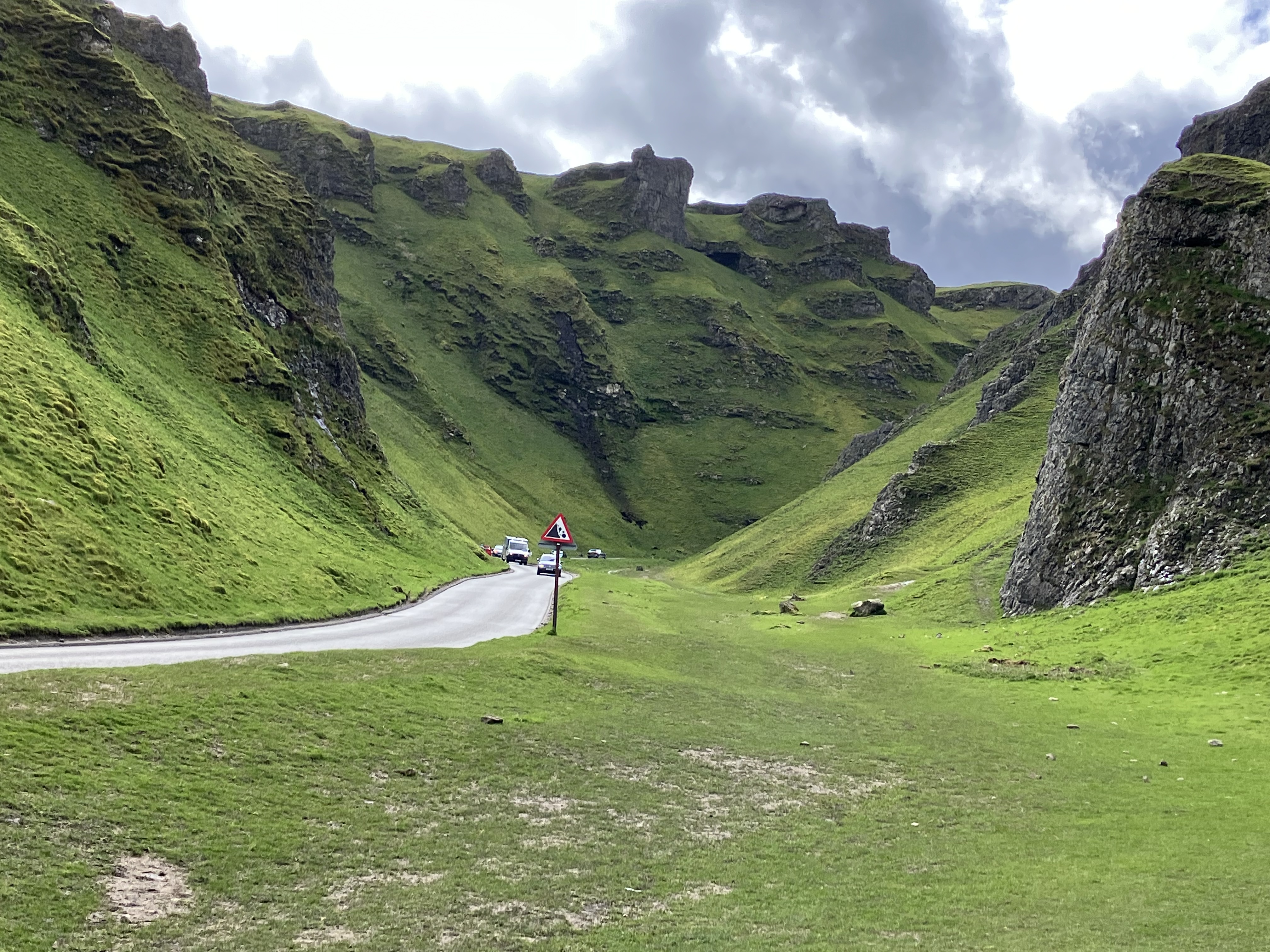 It was still pouring after lunch (ate some cake). We went for drive to Castleton—which we both remembered but couldn’t remember why (we are at that age when we can spend a happy half hour trying to remember things). Then we drove through Winnats Pass. This was spectacular, we turned the corner, and there it was—steep rocks rising on either side, tiny streams bubbling down to the valley. The road was single-carriage, and there were lines of cars waiting to pass, so I recommend you don’t visit in peak times. But definitely plan to visit, it’s amazing.