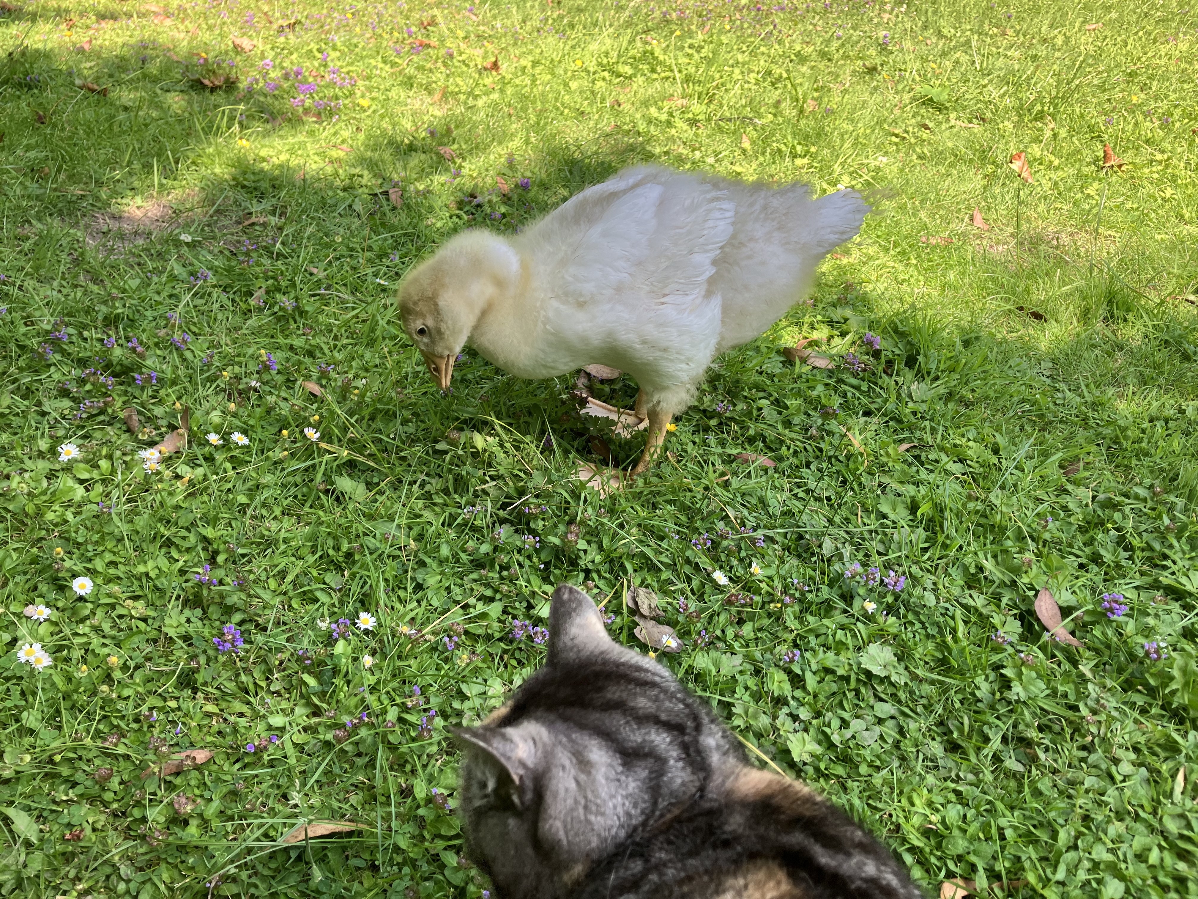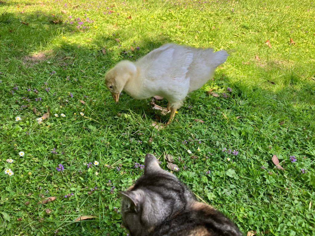 Goose lives with chick, and chickens are also fairly destructive to plants because they love to dig up the roots hunting for insects. (I have some sad petunias that I replant every evening, when the chickens are away for the night. They have been dug up 5 times now.) Even though I have planted grass seed, I doubt if it will last more than a day.