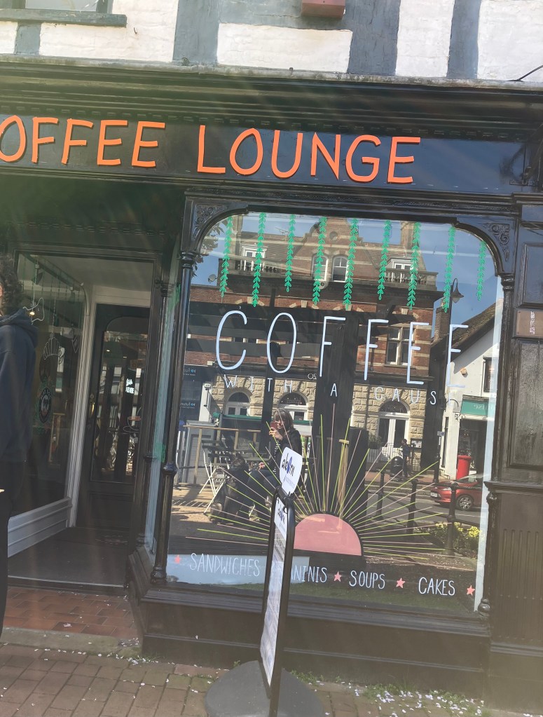 When my friend arrived we went into the cafe (the Mad Dog Cafe—appropriate name!) Meg, for some reason, baulked when we were inside and refused to walk any further. No idea what spooked her. We were next to a table, so sat there. Meg settled on the floor with her chew. She barked, briefly, at a woman carrying a tray, and at a baby shaking a toy. Other than that, she was very well-behaved, and I plan to return.