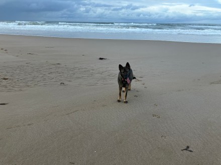 It wasn’t a great night’s sleep, because I woke when the trains whooshed past, and it was lighter than at home, and I was cold. But Meg was quiet all night, and seemed fine in the morning when I let her out of her crate.