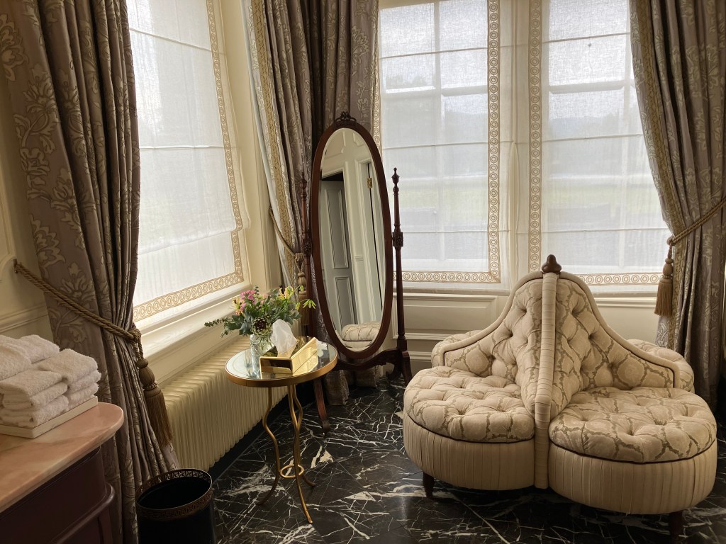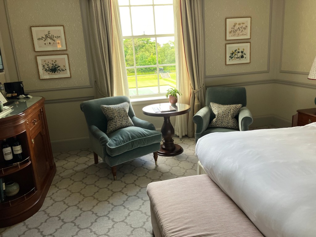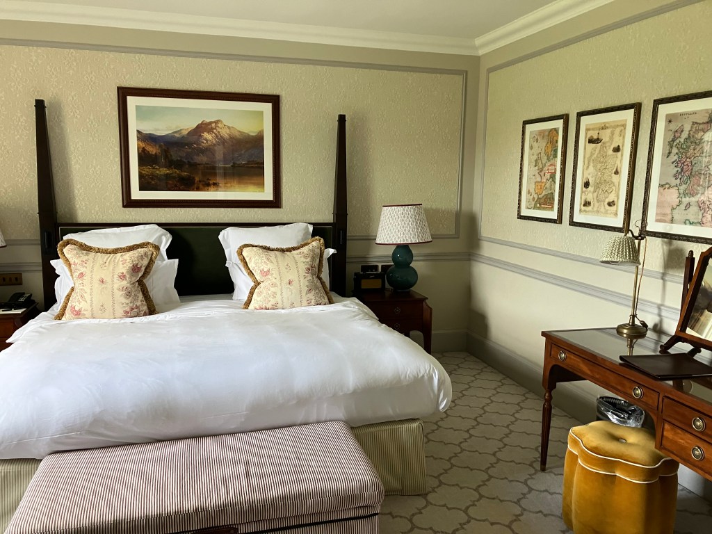 Our room was very luxurious, though was quite a long walk from reception (I don’t think it was one of their better rooms!) It had a desk and two easy chairs, and a huge telly. There was a cabinet offering free tea and coffee, bottles of water, and shortbread biscuits—and a cupboard displaying over-priced snacks that we could buy. The bathroom had double sinks, and a shower, and a huge free-standing claw-footed bath. The loo was in a separate room. There were toiletries, and dressing gowns and slippers, and—most importantly—plenty of plug sockets for phones and computers. Unfortunately, the pillows were very fat, but I had brought my nice flat pillow in the car (because hotels always seem to have very fat pillows).