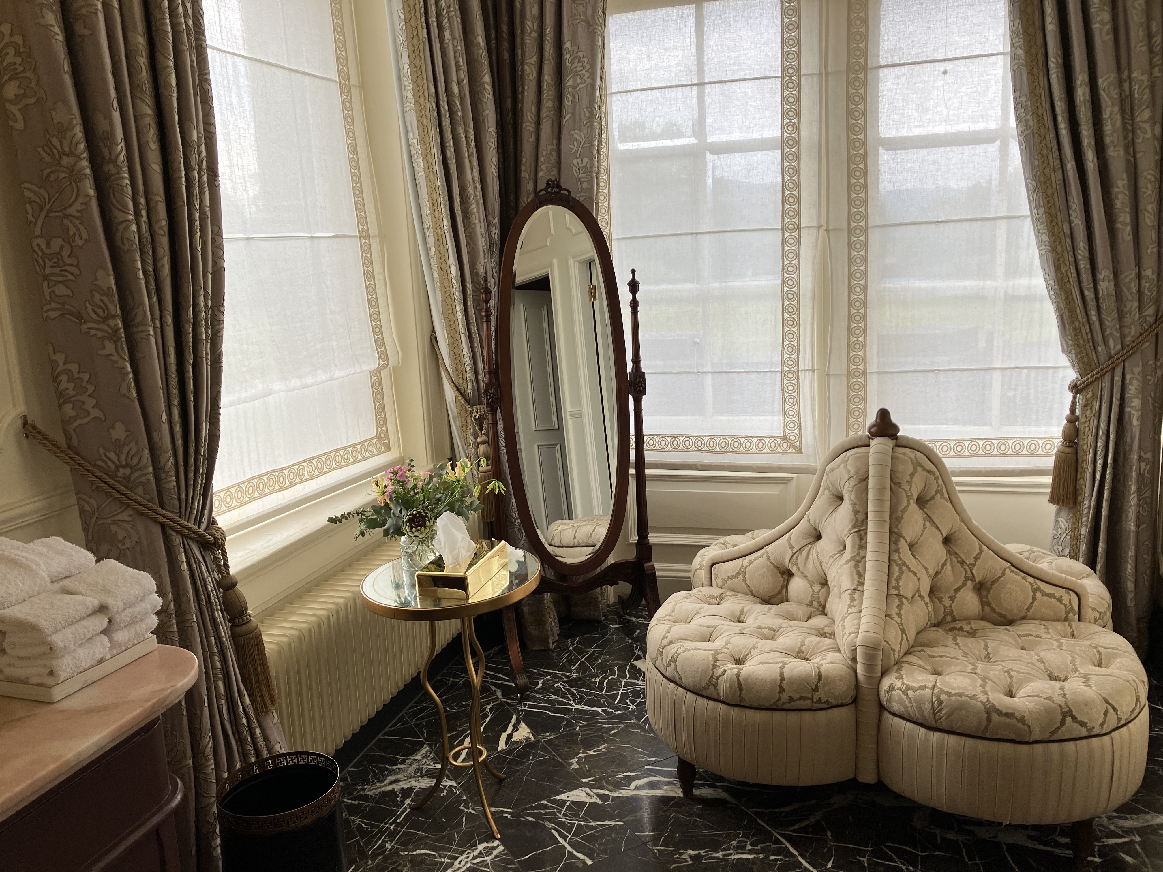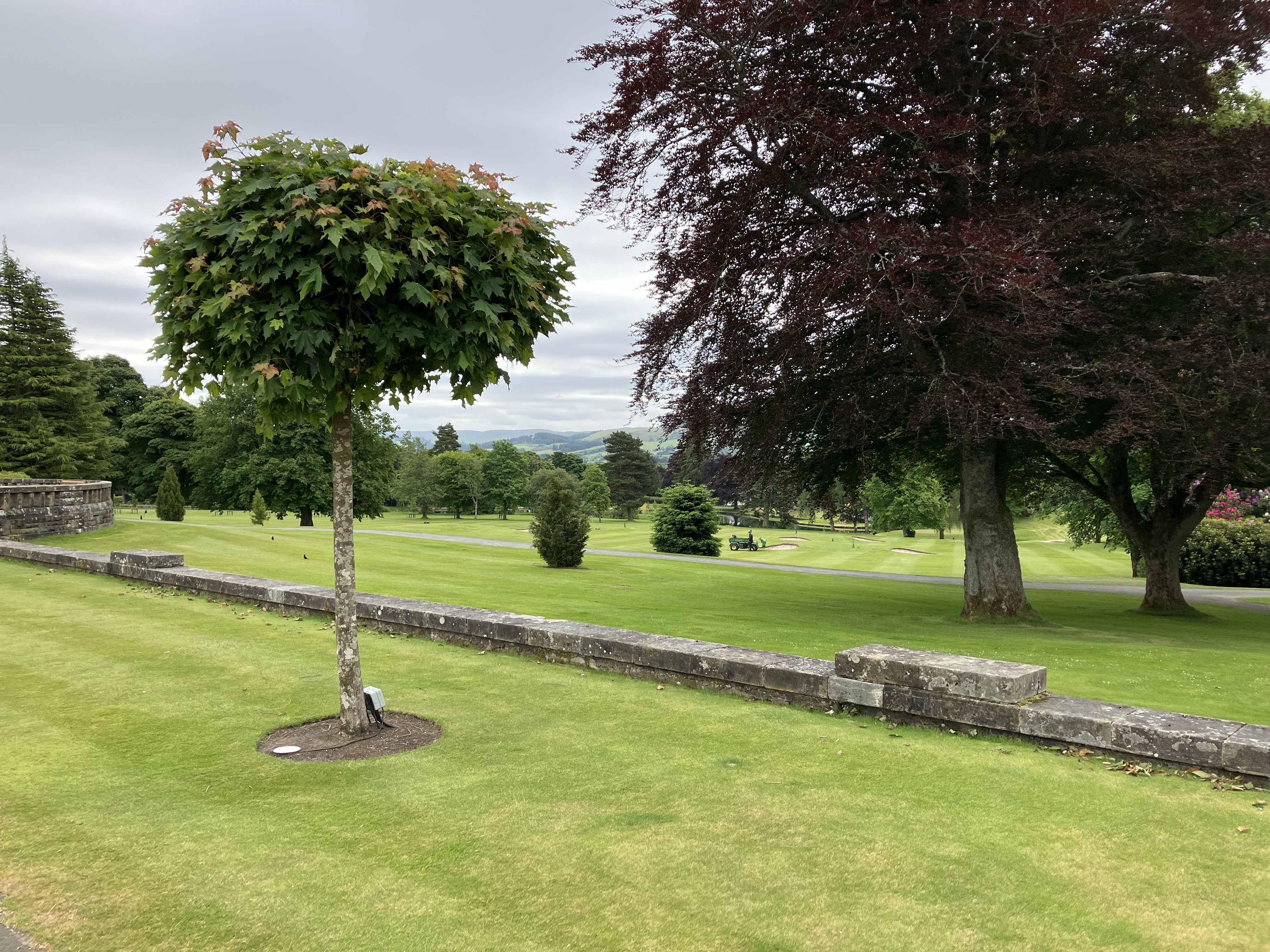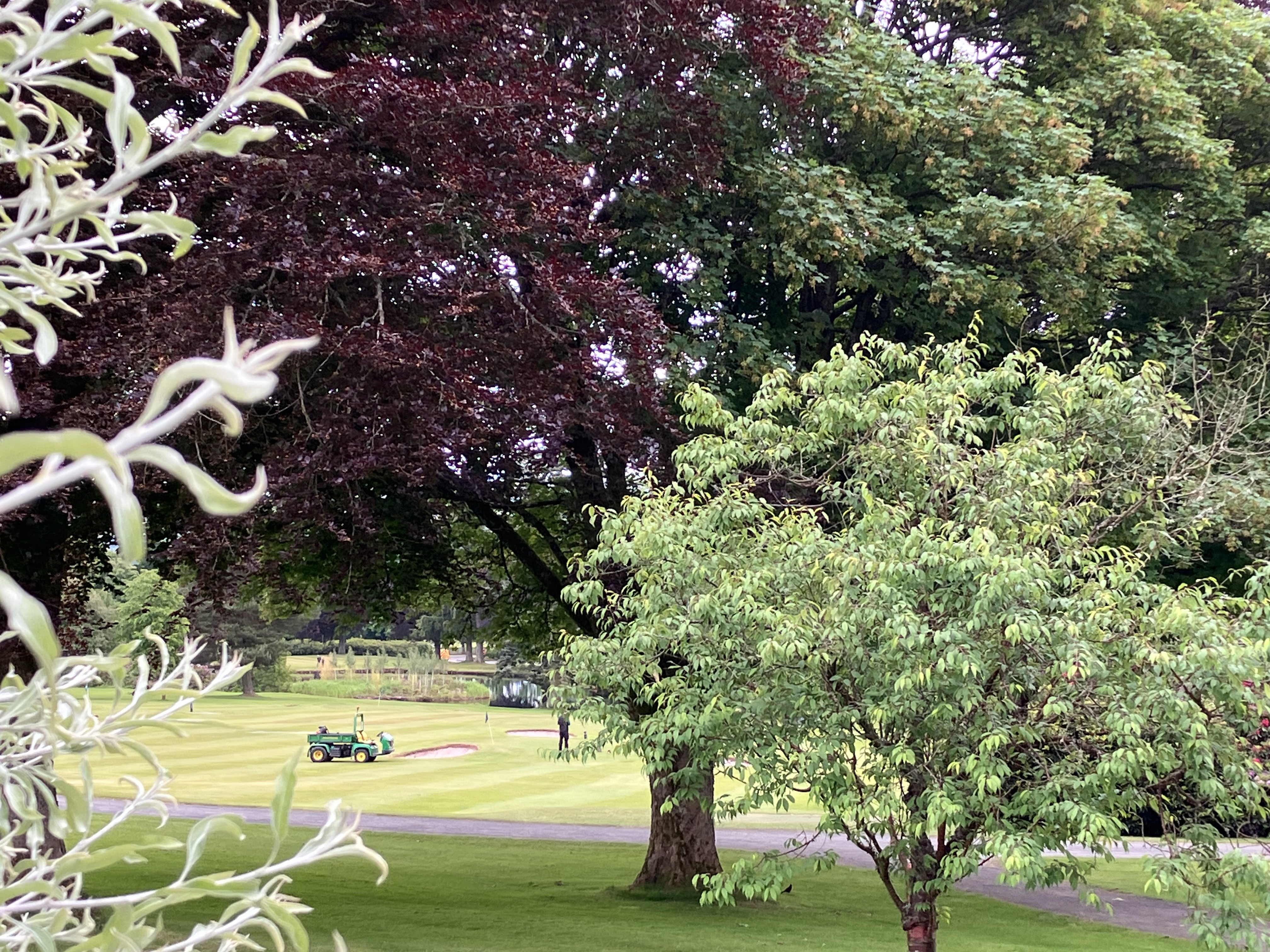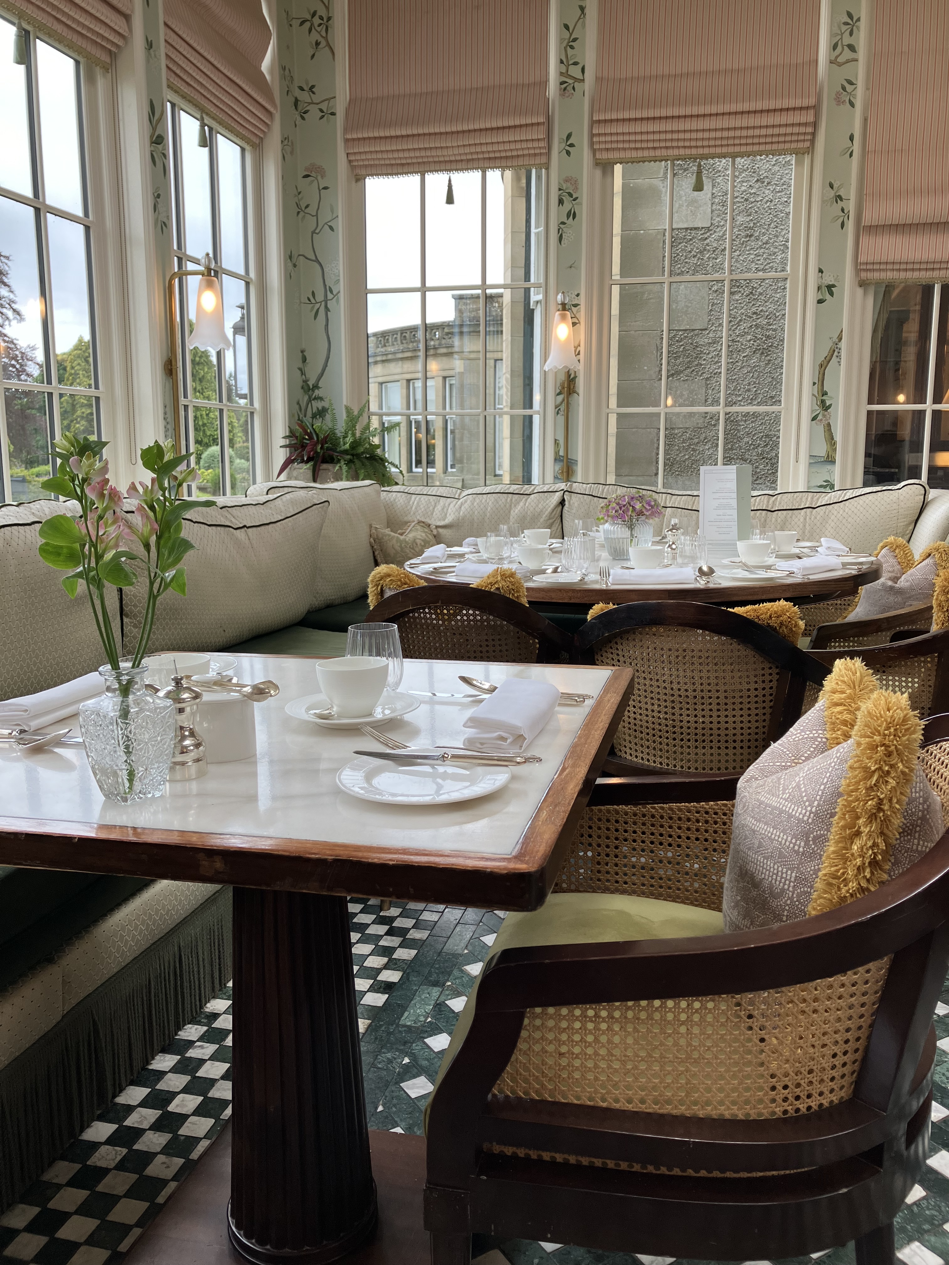 I didn’t sleep much—probably due to too much food and drink. I showered (marvellous shower—the water pressure wasn’t painful, but there was so much water a deluge of it, soaking me instantly). Went down for breakfast. Gleneagles has the best food. There was everything. We were offered fresh orange juice, and coffee, and I ordered buttermilk pancakes with smoked almonds and maple syrup. While waiting, we visited the buffet: displays of fresh fruit, and pastries, yogurts, cereals, every kind of cooked breakfast food, various breads and cakes. I filled a bowl with fresh strawberries (perfectly ripe) and Greek yogurt (perfectly creamy) and waited for my pancakes. Husband, who usually eats everything, restricted himself to sourdough bread with smoked salmon and poached egg, and another slice with bacon and mushrooms (proper mushrooms—hotels often use the nasty tinned variety). The coffee arrived in a silver pot, and we sat in a light conservatory filled with flower arrangements. Such a treat.