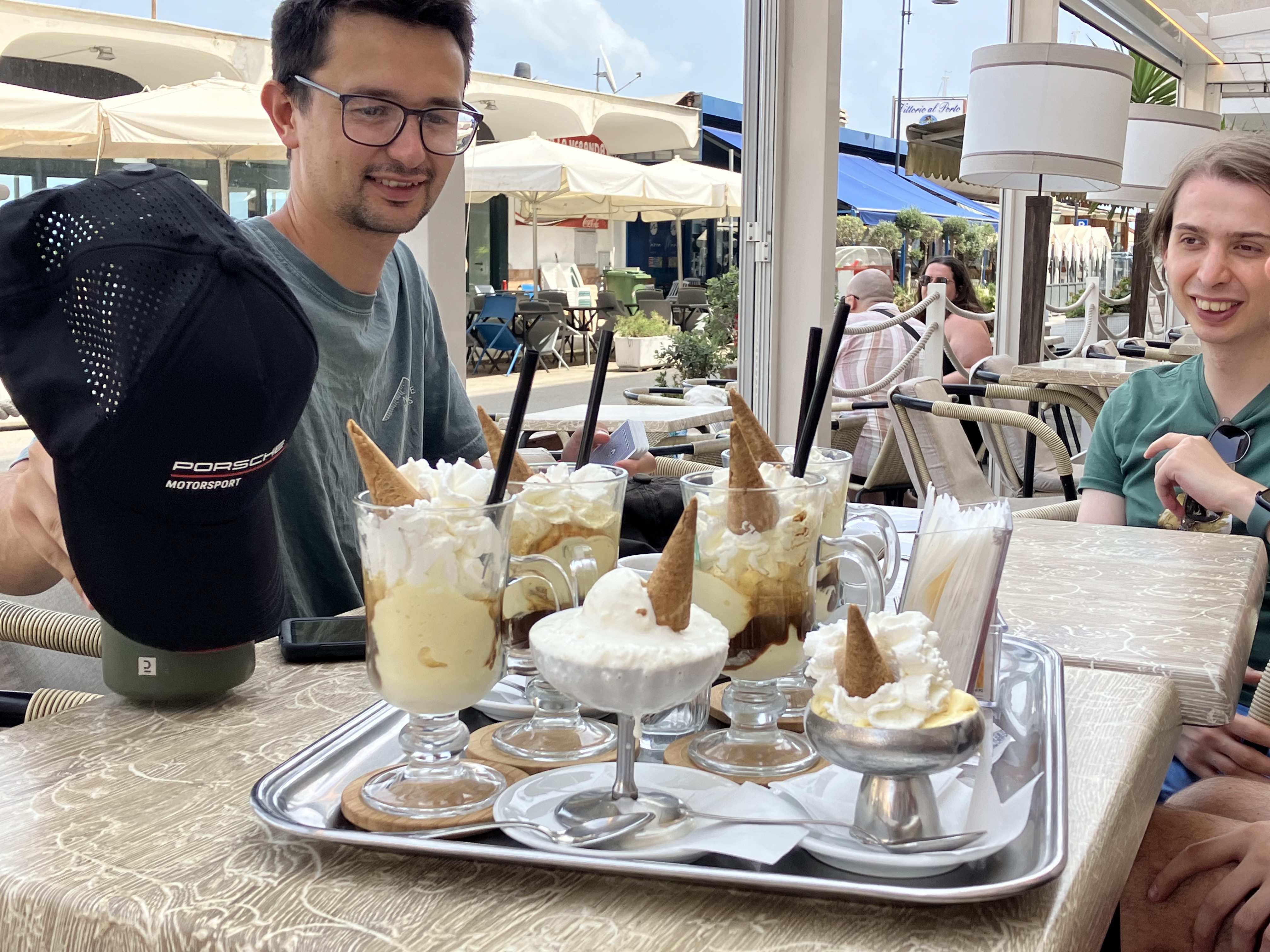 We walked to the port. There was a little harbour with boats. I like boats (as long as I don’t have to go on them—then I am less keen). We found a cafe, selling ice creams and espressos, and sat in the shade. An exciting tray of treats arrived, the sun was shining (but not on us) and we sat, watching people walk past. This is one of my favourite things. Coffee, ice-cream, family. Perfect. I also, weirdly, wished that I smoked—not to actually inhale the nicotine, but just the action, the having something to fiddle with; I am of the generation when smoking was something daring, that the naughty kids at school did, a grown-up thing. We discussed the possibility of sending a son to buy a packet—just to light one and hold it and look like a grown-up (I like looking like a grown-up occasionally) but then decided it was daft, and probably something I should have outgrown by now. I settled for coffee, and felt very happy.