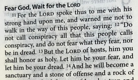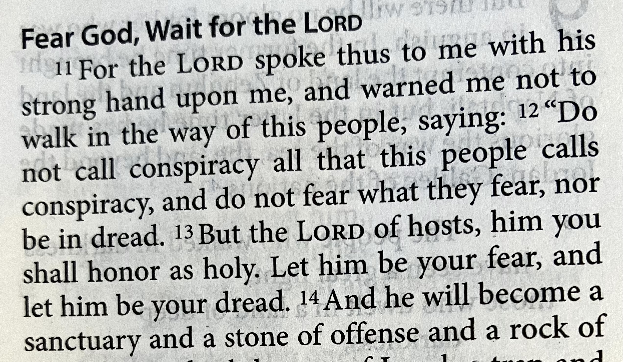 Now, I am taking these verses (Isaiah 8) completely out of context, and I am applying them in a way that was not at all how the original author expected them to be applied, and I am ignoring all the verses before and after. Usually I would think this was a slightly dodgy way to use Scripture, but I think, if I am only applying it to myself, and not using it to teach/correct other people, then it’s okay. (Sometimes the writers of the New Testament did the same thing.) I think sometimes a few verses might apply directly to the reader (me) and that is how Scripture ‘speaks’ today. So, with the health warning that I am not trying to teach anything from these out-of-context words, which you can apply however you feel is appropriate, this is what I read this morning: