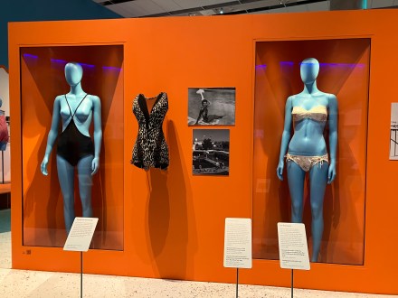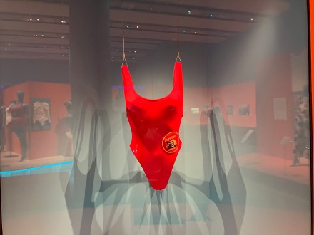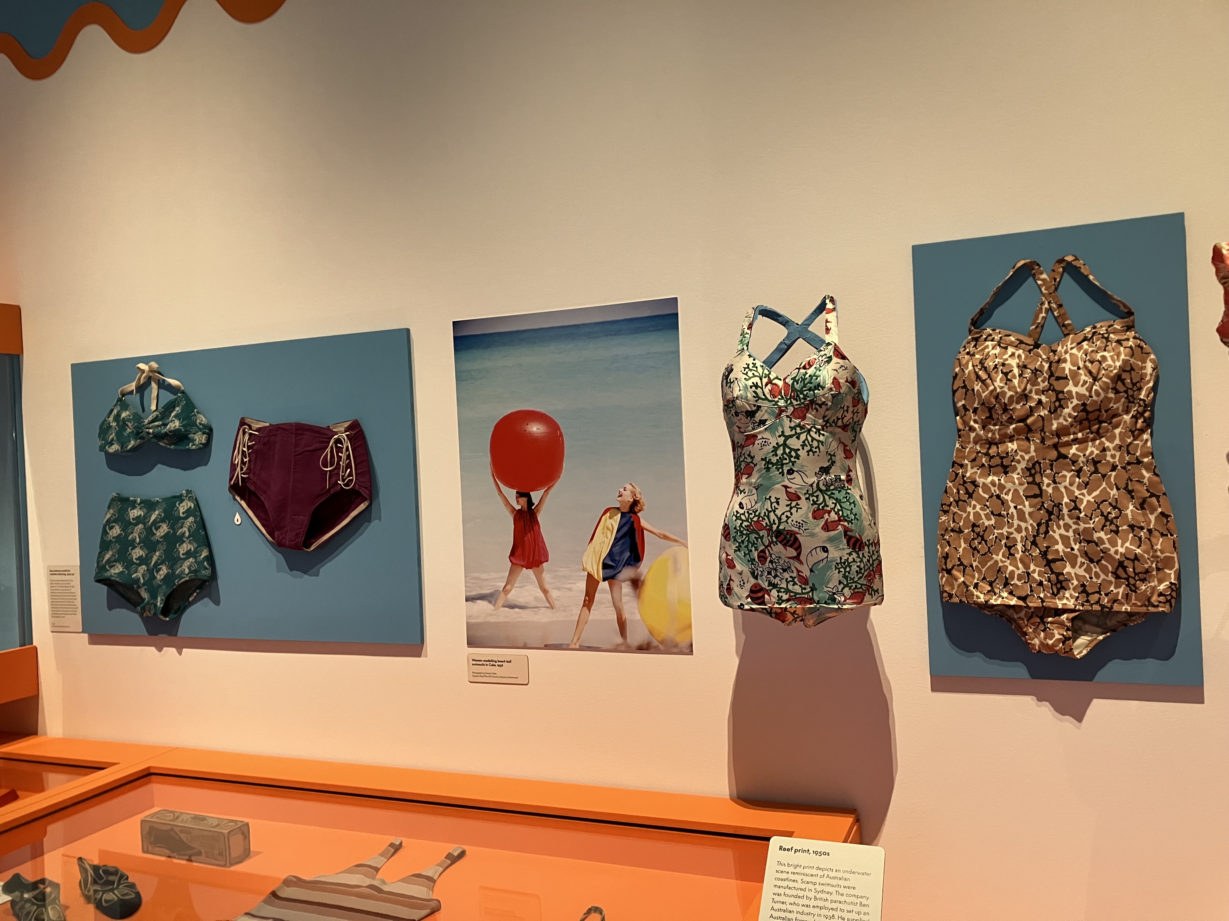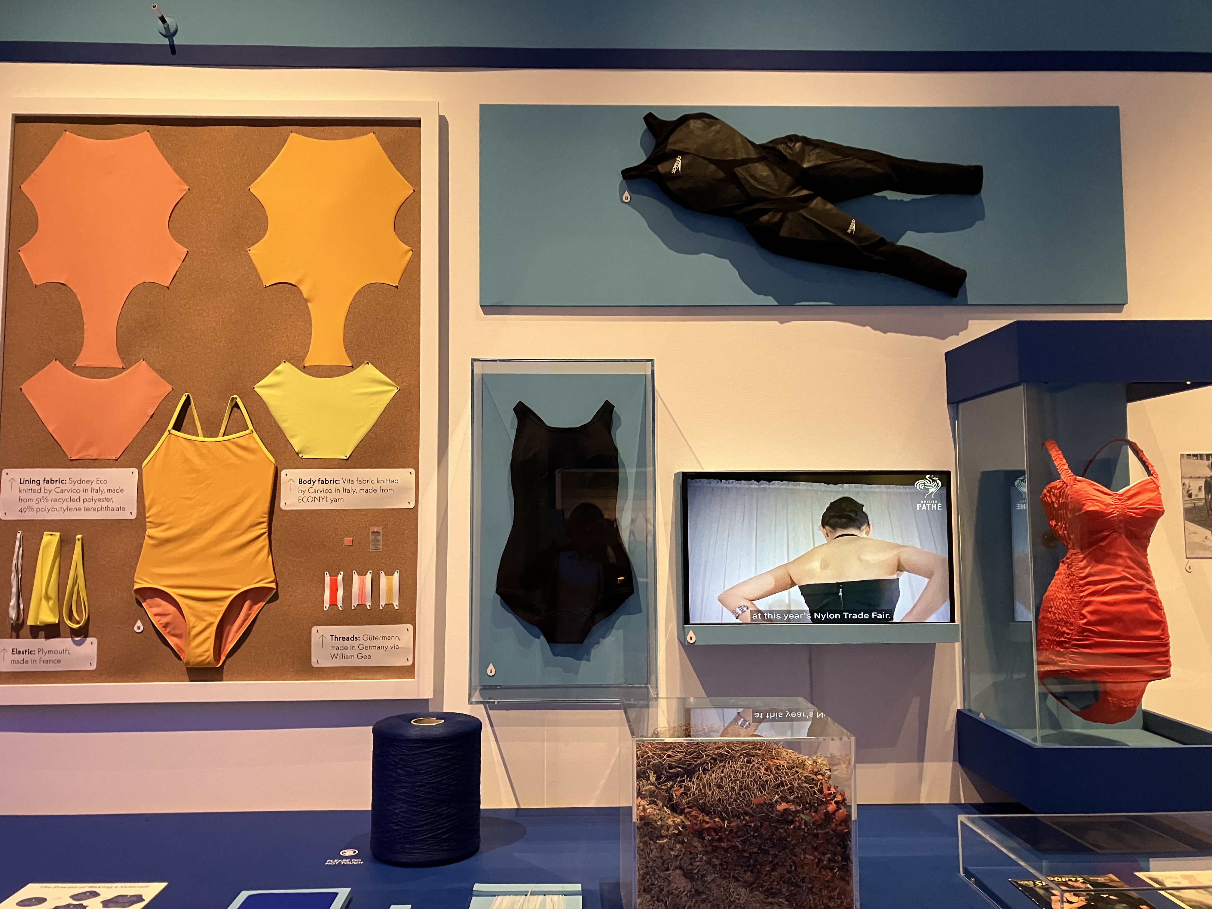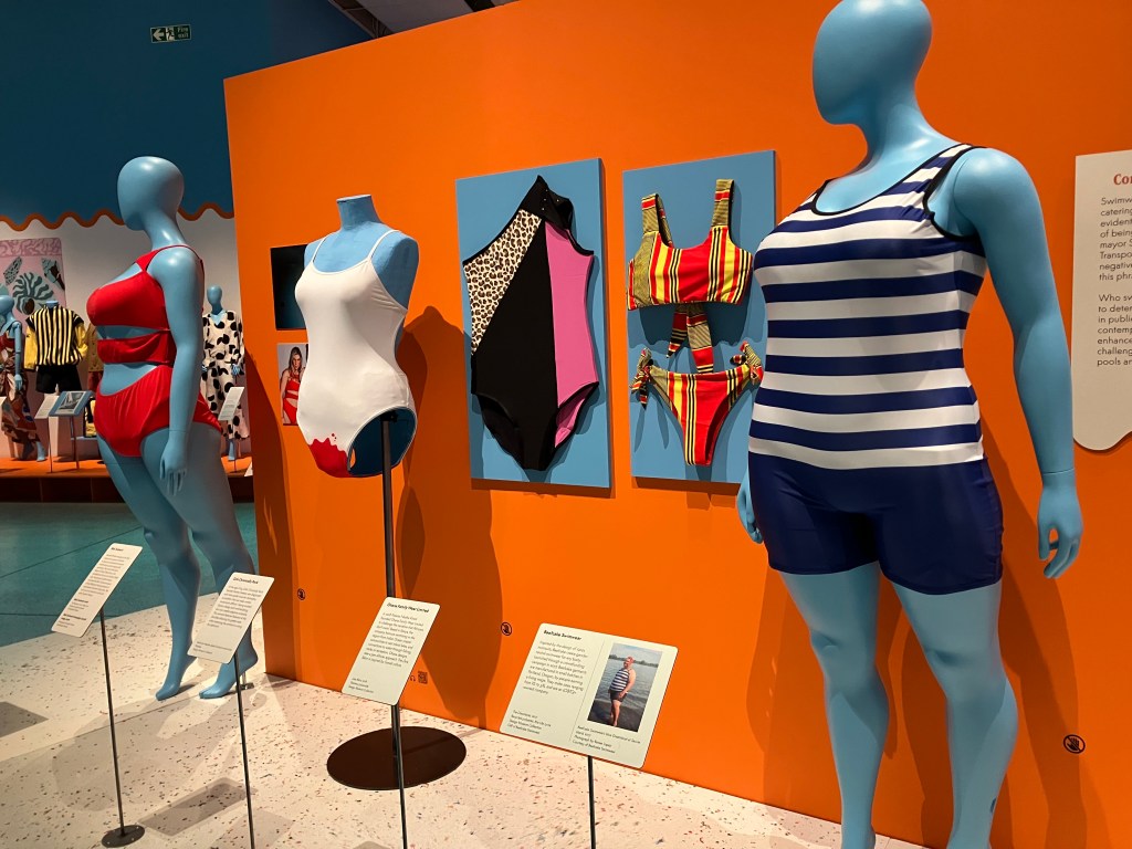 We went to see the Splash exhibit. It was mainly a display showing various styles of swimwear—some of which would be rather draughty! Pamela Anderson obviously decided not to attend in person after all, but her swimwear was there, so I didn’t feel I had been dishonest. (I have similar measurements to Pamela Anderson, just arranged in a different order.)