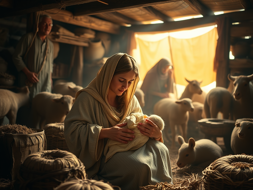I too needed to sleep. Joseph fetched fresh hay and put it in the animal’s manger, covering it with a soft blanket. I didn’t want him to put the baby there, I wanted to keep him on the bed next to me, but Joseph was worried I might roll on him in my sleep. Then he laid the baby down and told me to sleep. He looked deep into my eyes and brushed my collar bone lightly with his fingers.