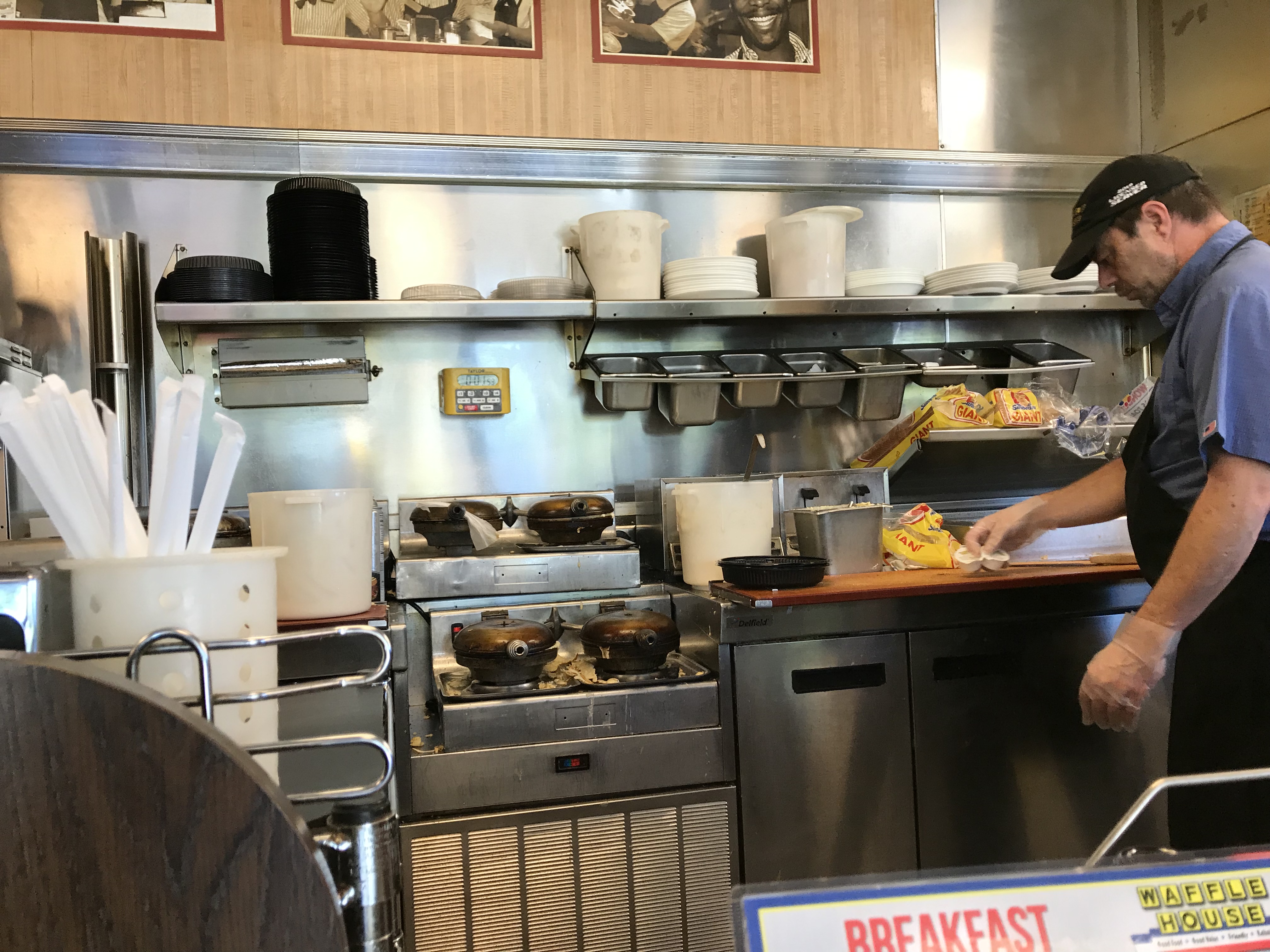 We drove along major roads, where there were many signs for places to eat. When you check on Google maps, some of these are a fair distance from the actual road. One eatery that was often advertised, and was near to the main road, was Waffle House, so we decided to stop and try it. I like pancakes, and waffles are similar, and we had eaten several times at IHOP (International House of Pancakes) and liked it. We thought Waffle House might be similar. It wasn’t—or at least, the one we stopped at wasn’t.