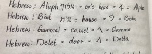 (Personally, I don’t think the letters look very like the objects they are meant to represent, and nor does Ganor. I can see that Gamma looks a little like a camel’s hump, but how is Beta a symbol for a house?)