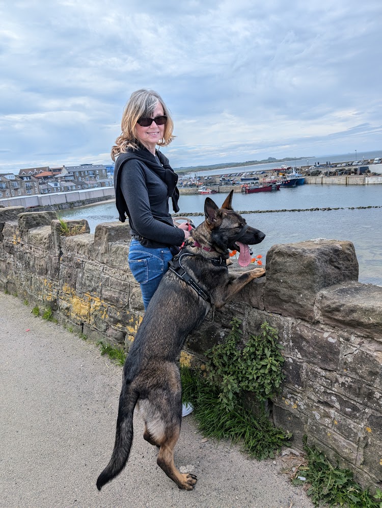 She is getting better at stairs already. Today I put her ball on increasingly higher steps, and she walked right to the top of the flight without a problem. Coming down is more precarious, because she tries to leap the last few steps—which would be dangerous if she was on the lead—so I will keep teaching her to go slowly up and down. (And is quite dangerous if anyone stands near, as they might get a flying German Shepherd land on their head.) She’s fun to teach, because she learns so quickly. Just as long as she doesn’t kill someone by mistake…