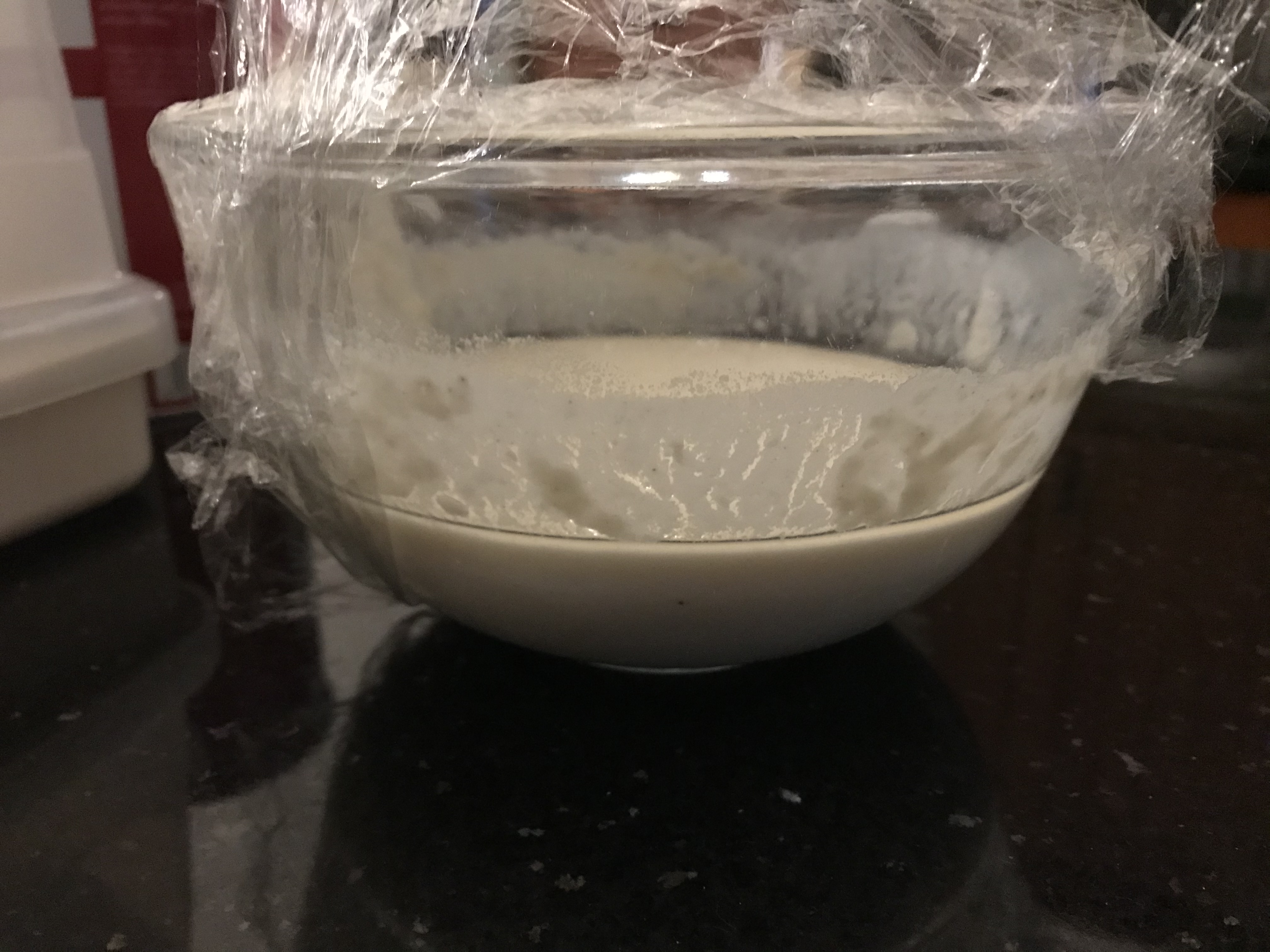 I found a recipe online, and made my ‘starter’. This was a goo of milk, yogurt and flour. Apparently, in days gone by, people made the starter simply by leaving flour (probably whole grain) to soak, until it started to ferment, and this became the base for the starter. But it’s quicker with yogurt, and less likely to go rancid. Each day, I added flour and water. The first couple of days, it expanded slightly, and bubbles appeared on the surface. But then it went flat, and looked dead. I think my house was too cold, and the bacteria couldn’t be bothered to do anything. I moved it to a warmer place, and it started to bubble again. I made it in a small Pyrex bowl, covered with clingfilm and a tea towel (to keep it insulated, as it needs to be warm, but not too warm).