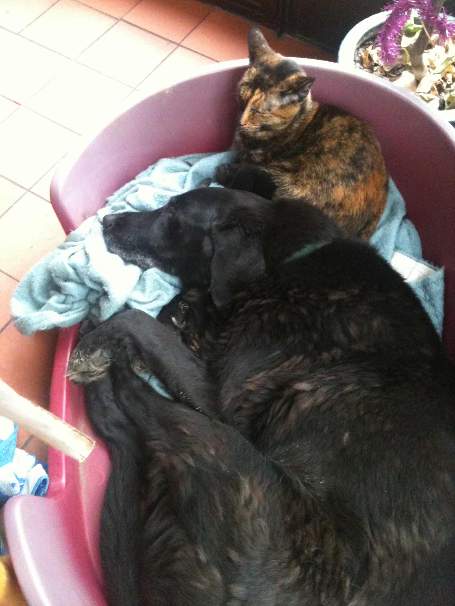 At some point, Mabel woke. She found herself under an unexpected weight whose smell she recognised as Suki’s. She knew that close interaction usually resulted in pain and therefore she lay very still, hoping that the cat would leave of her own volition. Thus it was that when Suki herself woke, the dog was still calmly immobile beneath her.