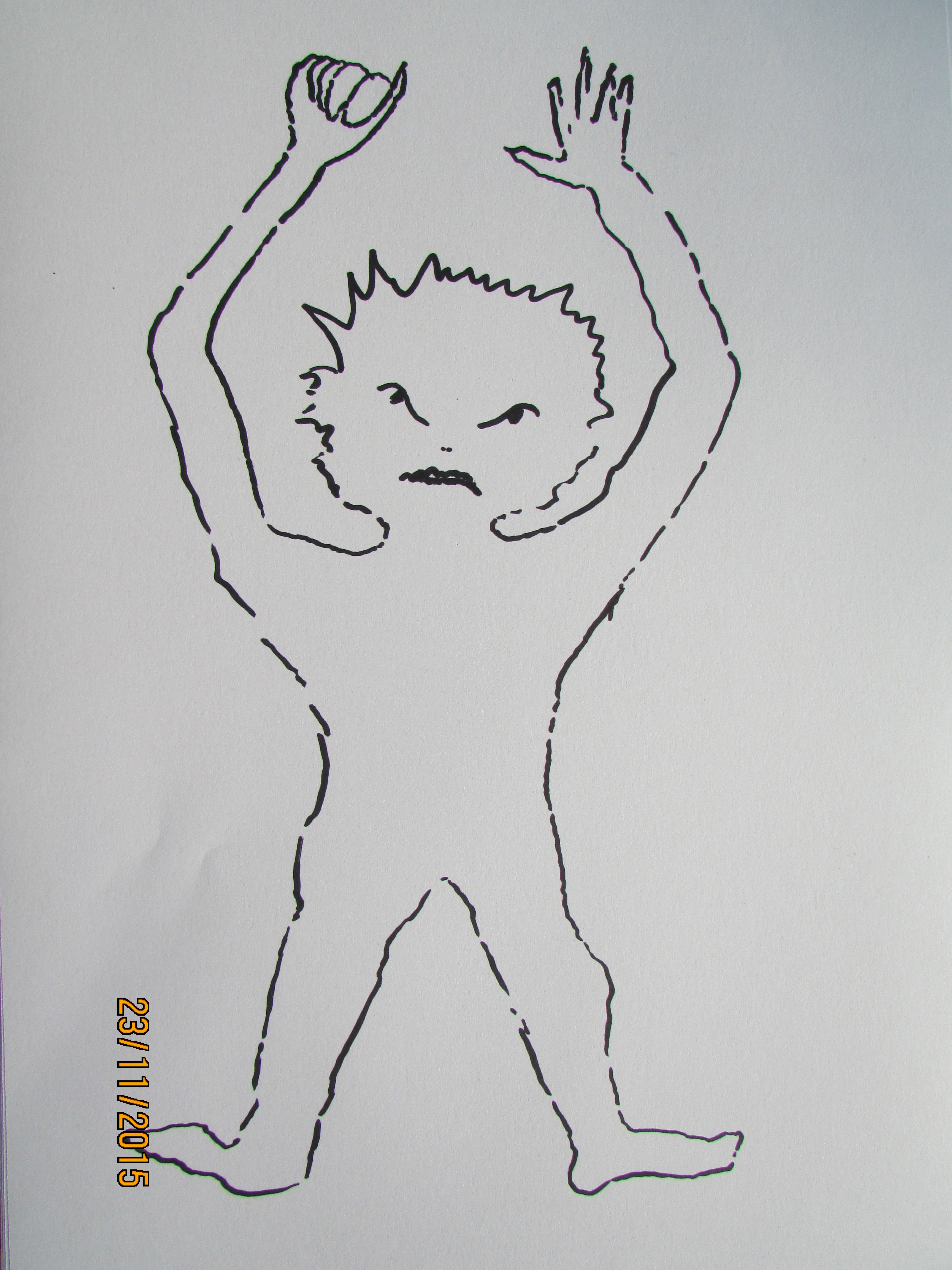 He went into the kitchen and smashed all my plates. He over-turned chairs and tore my cushions. He punched my children and spat at my dog. When I went near he scratched me and made me bleed. The house was dark, he closed all the curtains. I was hurt and frightened and angry.