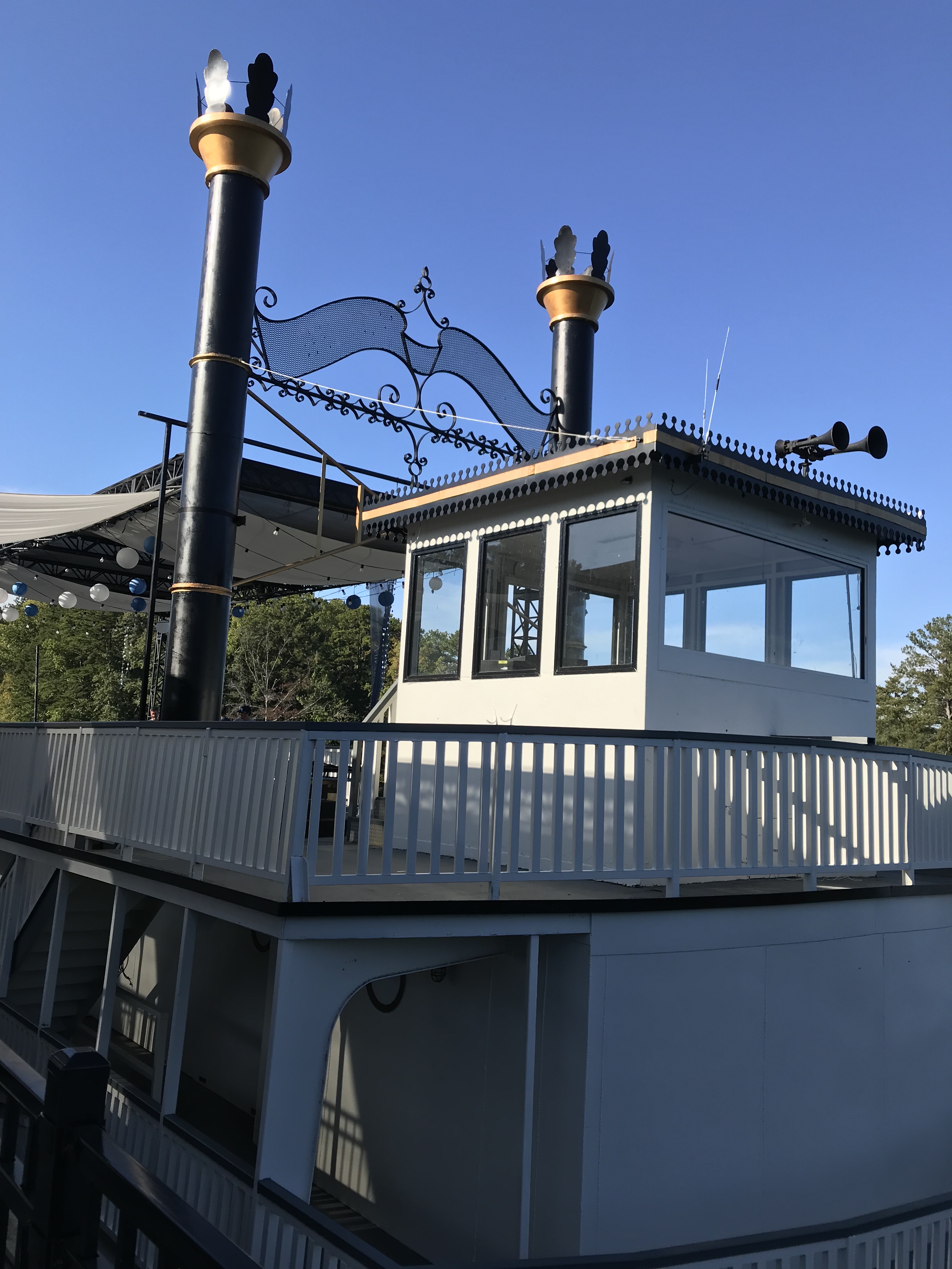 We then set off to find the paddle-steamer I had been on as a child. Husband reminded me that I am now quite old, and the steamer was probably long gone—so I was delighted when I saw it, hidden behind some trees. It was being refitted, for a Netflix series (Ozark) and there was a film crew building a casino set. But I was glad I had found it.