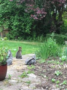 We also had birds in the nesting boxes that Uncle Frank made. He gave them to me ages ago, and I put them near the kitchen window (good plan) so I would see if any birds took an interest. We had some great tits in the area, and I guessed the eggs must have hatched when I noticed a welcoming committee of four cats staring at the nesting box. I started to shut the cats in during the day, letting them out at night. But then one morning, I came down to find one cat up the tree, and by the time I had run outside, he had fished a baby out of the box and was playing with it. I grabbed the baby, shoved it back into the box, and shut the cat inside. Husband then assembled some protective obstacles around the base of the trees. The view from my kitchen window resembled a cross between Guantanamo Bay and a WW1 trench. Not quite what I’d hoped, but at least the birds were safe.