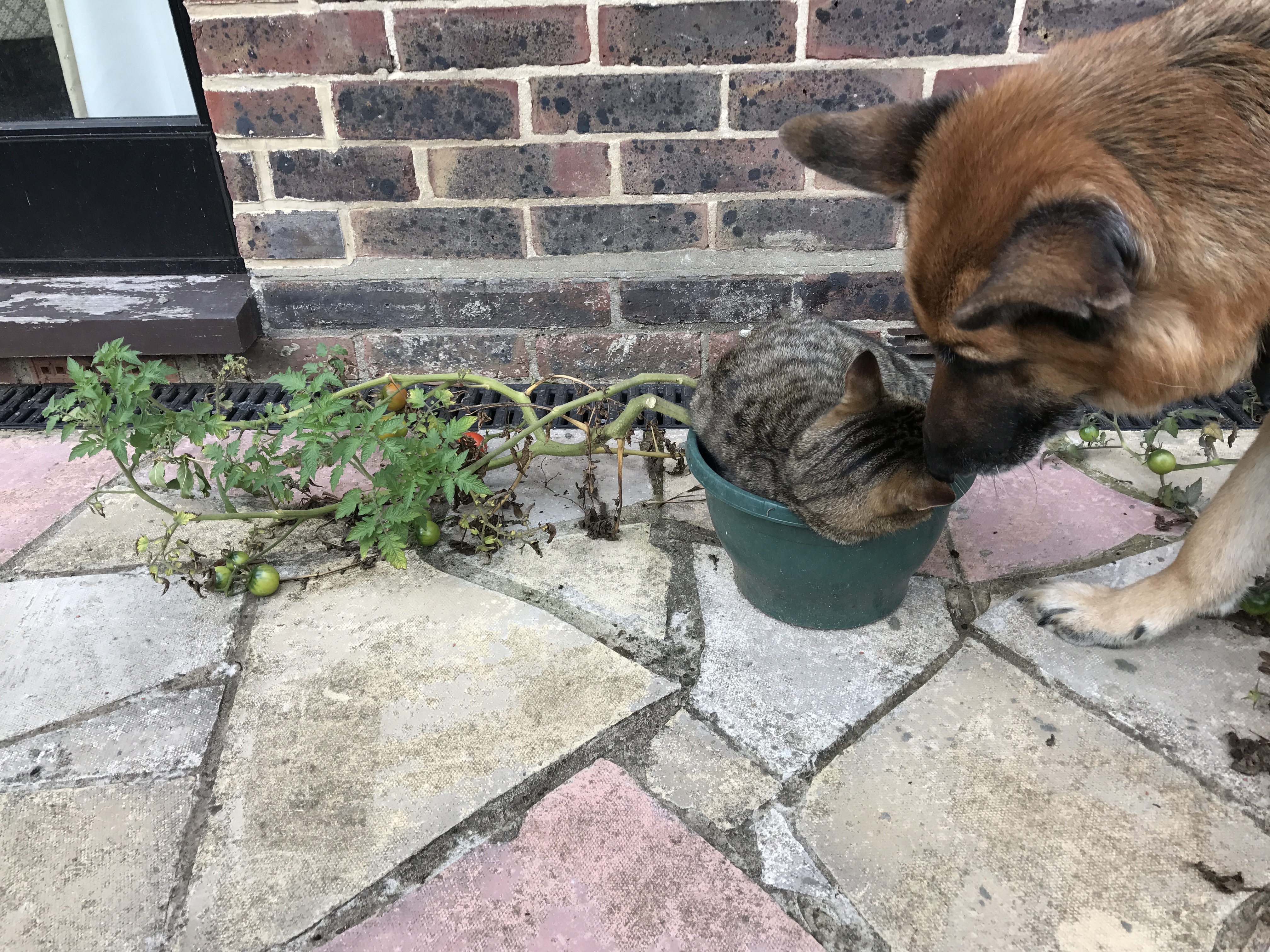 In the pub I tied Meg to a wall, and pulled a ball from my pocket. At home she will concentrate on a ball for a long time, waiting until she is allowed to have it. It worked less well in the pub. Initially she lay down, with her paws either side, and her head above the ball—not touching (which was not allowed) but only millimetres away. When she thought I wasn’t looking, she nudged it forward. I then tried giving her the ball, thinking that the treat of being allowed the ball might keep her quiet for a while. But Meg wanted me to throw it, and when I didn’t, she did. She was fairly near some steps, and she managed to toss the ball towards them, and then lurched forward to get it, nearly pulling the hook out of the wall she was attached to. At one point a woman passed, and Meg barked her ‘big dog’ bark and I realised the woman was carrying a small dog. Everyone in the pub jumped, and then stared. I apologised, tried to get her to refocus on the ball. It was not a relaxing lunch. However, it was not completely terrible, so I might try it again.