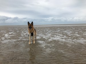 The house survived, and there was a vacuum cleaner to clear up the bucket loads of sand that Meg carries in her coat. The sprinkling of sand in every room she went into was constant, even hours after returning from the beach, when completely dry and having been brushed in the garden—always there was sand in her coat. The garden was a big help, though a previous dog had chewed a chunk of the wooden decking (I am assuming it was a dog) and Meg noticed it on the second day. Although she never chewed it, I could see her thinking about it, so we could never leave her unattended in the garden after that, which was a shame. She also developed bit of a tummy upset—I’m guessing down to eating sand and trying to drink salty water. She was very good about telling me when she needed to go outside, so there were never any accidents, but it made clearing up after her in the garden a ghastly job. Taking Meg on holiday is only relaxing up to a point. (But in this case, the pleasure of watching her run on the beach was worth the pain.)
