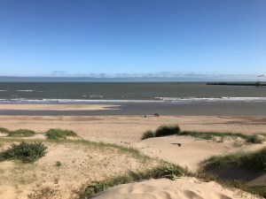 Camber Sands is a marvellous beach. It is divided from the Rye beach by a deep wide river that the fishing boats use, and from there, you can walk for miles, all the way to Dungeness. When the tide goes out, there are acres of flat hard sand—popular with dogs and families and horses. Towards Dungeness there are wind-surfers and athletic people (mostly men) riding dangerous wind-powered vehicles and flying into the air attached to giant sails and all sorts of crafts on the water. But down nearer to Rye, it’s safe to walk, and we love it.