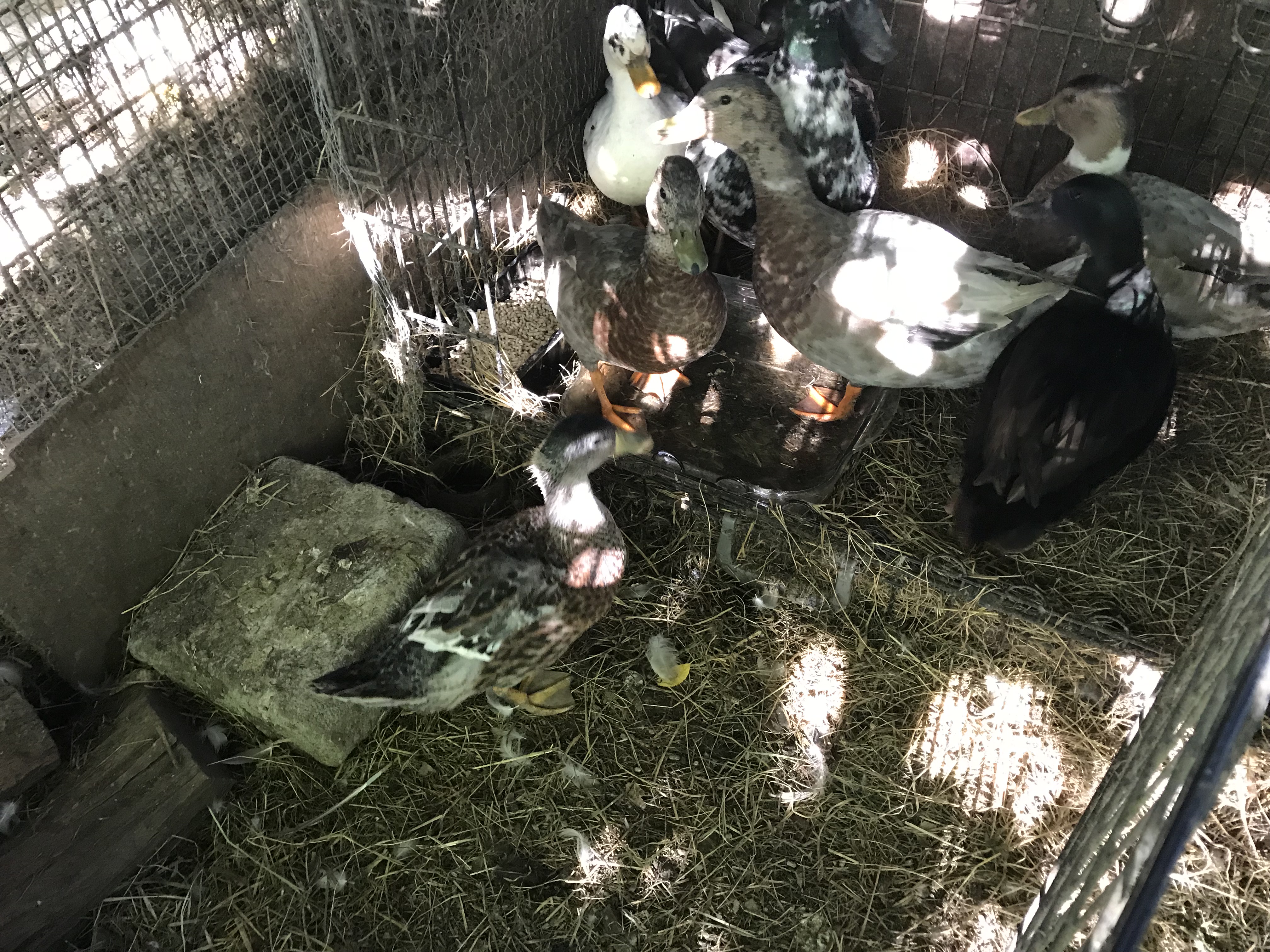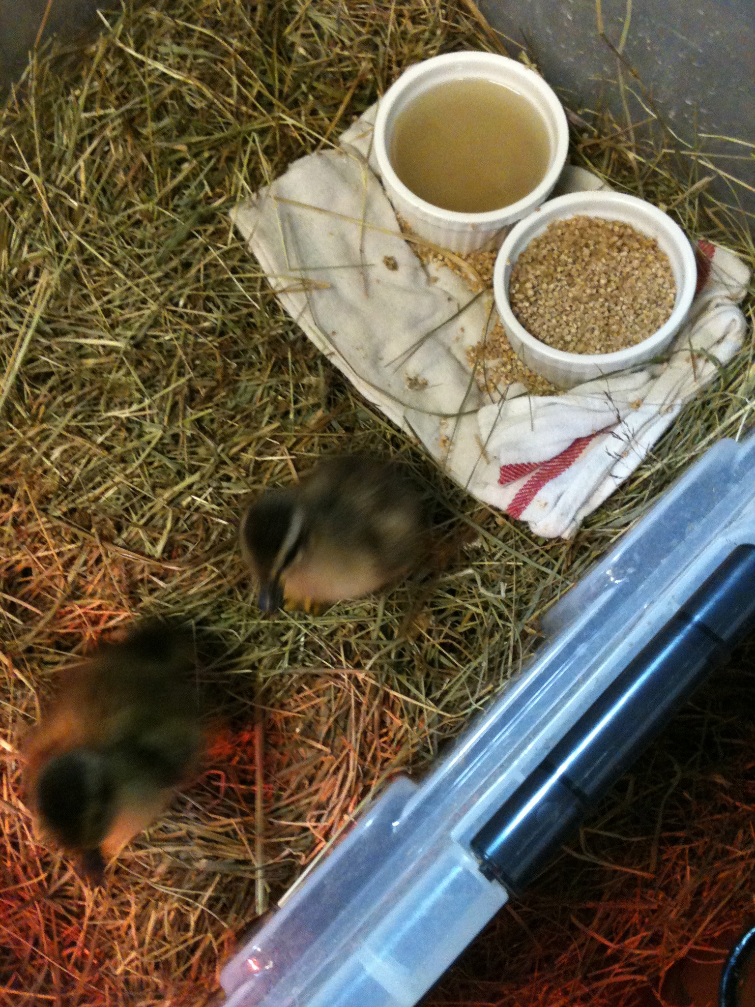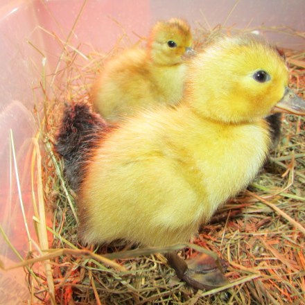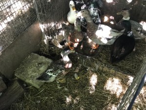 If I am raising the chicks or ducklings, I put them into a large plastic crate lined with hay. They need a heat lamp, water and food. I experiment with the height of the heat lamp – if they are huddled directly underneath it is too high, if they are in a far corner, it is too low. The water needs to be in a very shallow container so they can not drown (they are cute but stupid.) I feed them chick crumb. Some people give chicks medicated chick crumb because chicks are prone to infections (It’s not unusual for an apparently healthy chick to suddenly die.) However, I think it is better not to introduce antibiotics unless an animal is actually ill and I would prefer to risk the odd bird by giving them a more natural chick crumb. You cannot feed medicated chick crumb to ducklings or they will die.