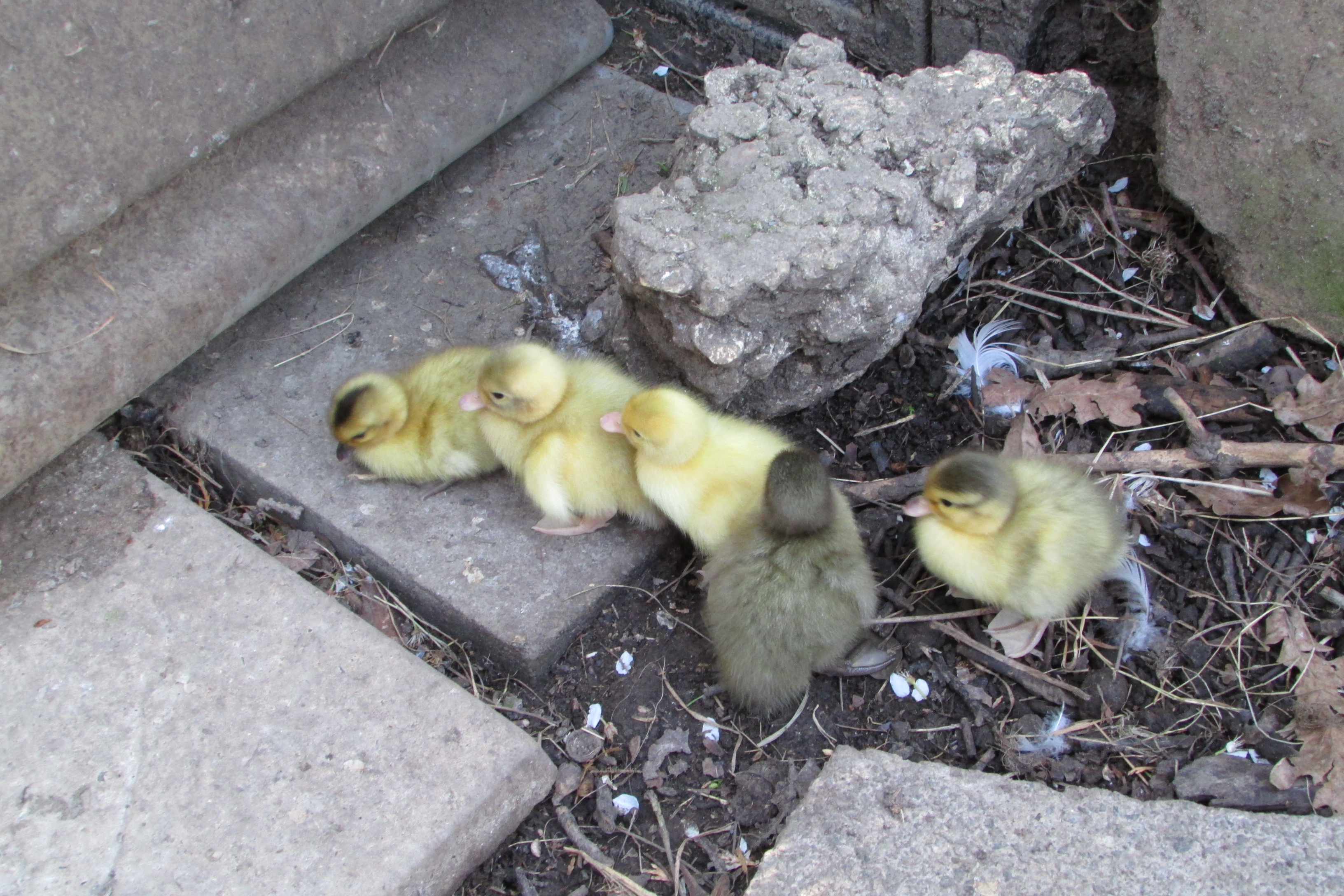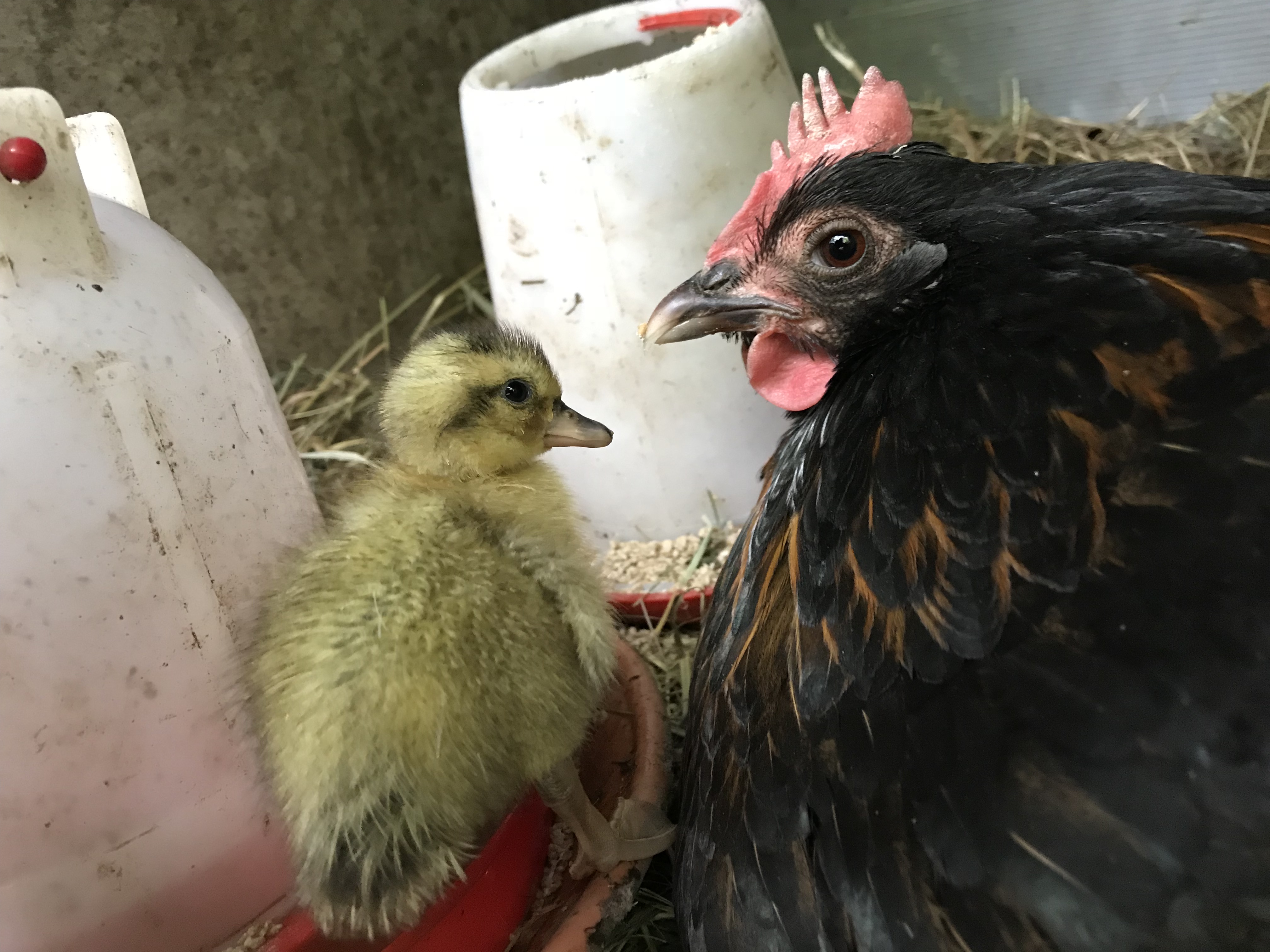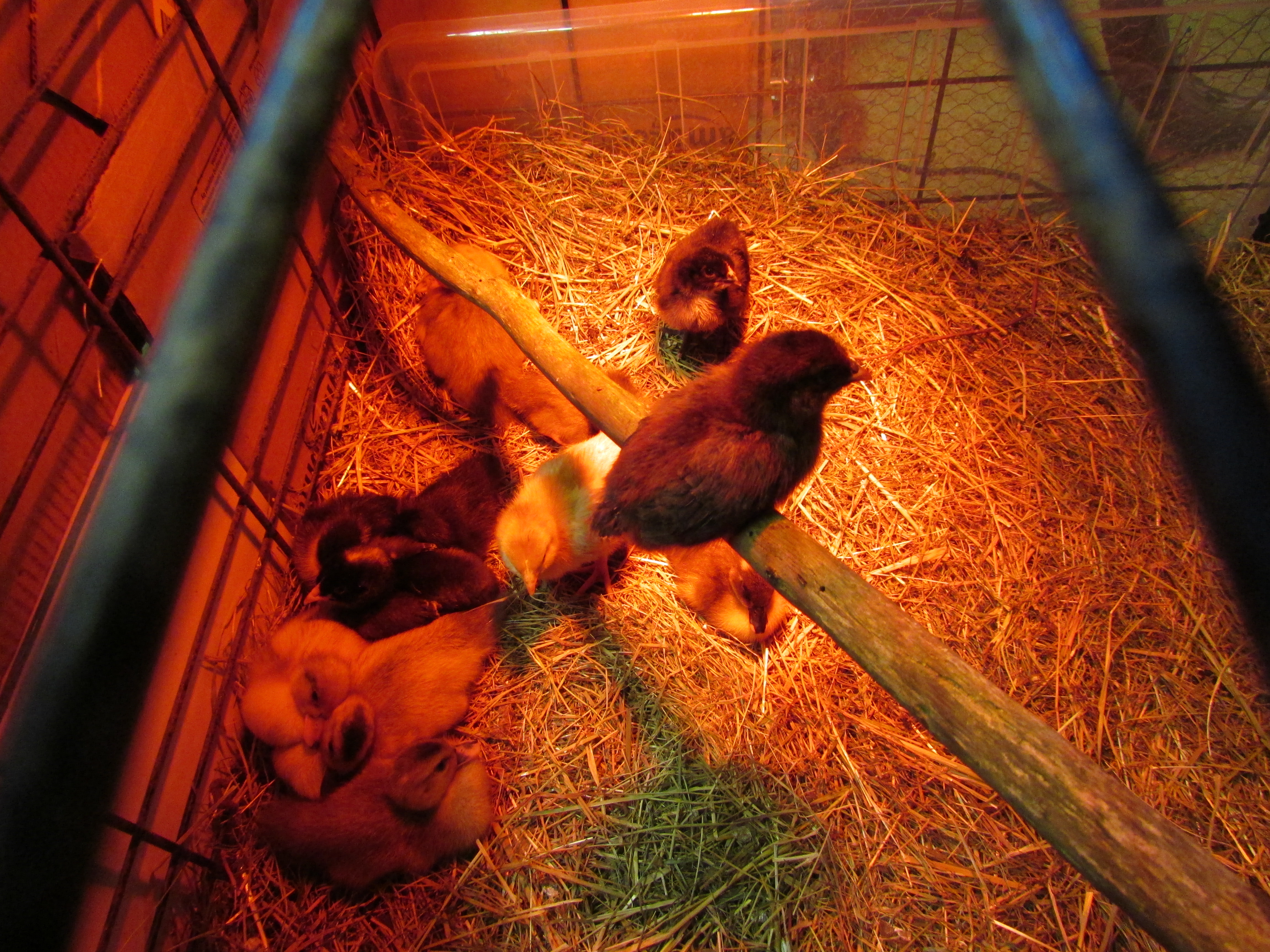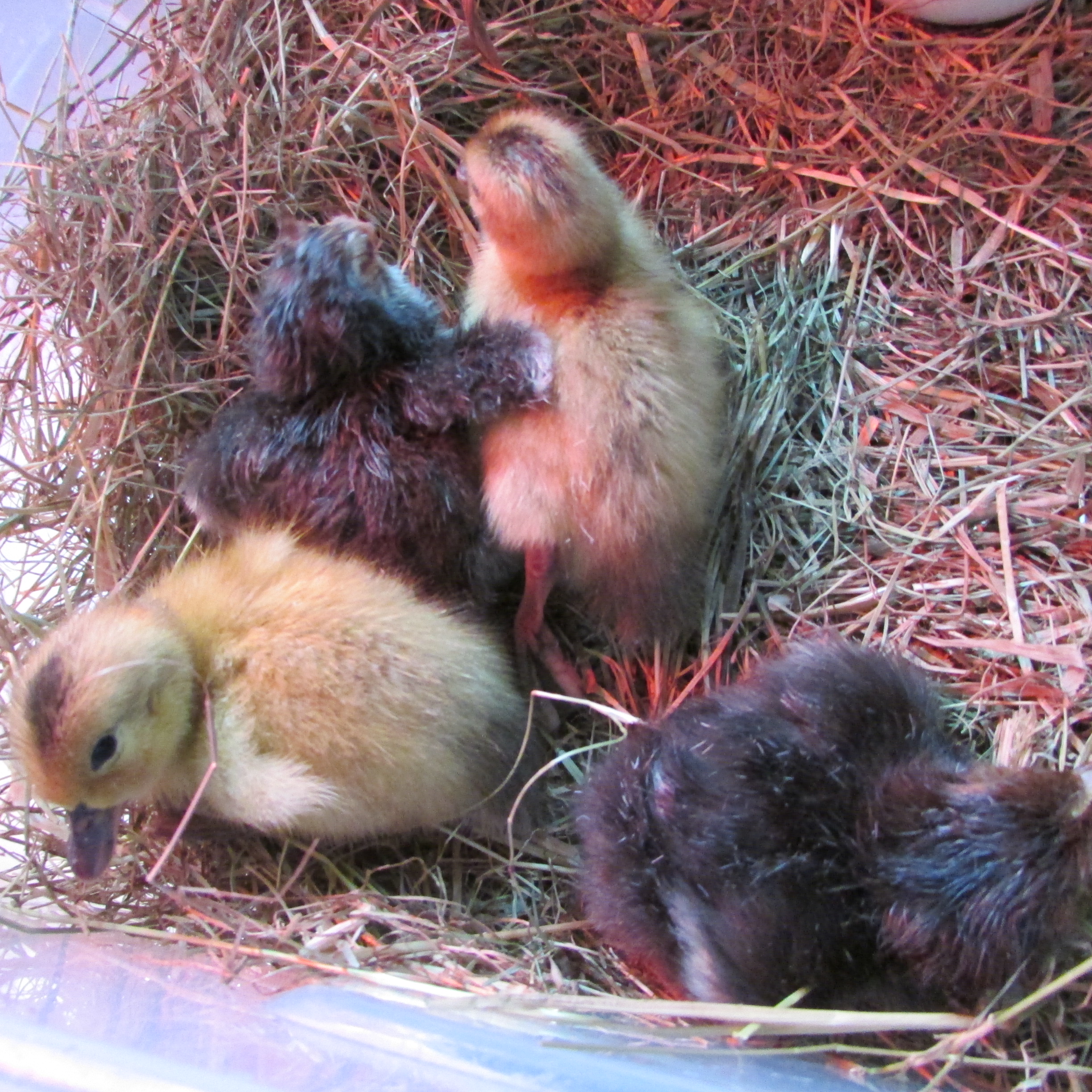 When it is fully mobile, move it to the next stage. This will either be a brooder – a box with a heat lamp, or a mother hen. I have read that it is difficult to introduce new hens to an established flock (because they fight, unlike ducks, who will welcome anyone.) It is therefore much better to give the new hatchlings to your broody hen to raise. I simply carry them outside and put them next to her nesting box. She will look extremely surprised for a few minutes, then when no one else claims the chick, she will push it underneath her and you can relax!
